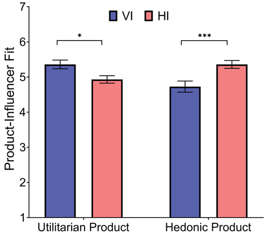 A repeated-measures ANOVA revealed no significant main effects of influencer type, F (1, 104) = 1.93, p = 0.168, or product type, F (1, 104) = 0.26, p = 0.612. However, a significant interaction effect was found between influencer type and product type, F (1, 104) = 34.63, p < 0.001, = 0.25. For utilitarian products, participants perceived VIs (M = 5.40, SD = 0.90) as a significantly better fit compared to HIs (M = 4.79, SD = 1.26, p = 0.005). Conversely, for hedonic products, participants perceived HIs (M = 5.59, SD = 1.02) as a better fit than VIs (M = 4.45, SD = 1.59, p < 0.001).