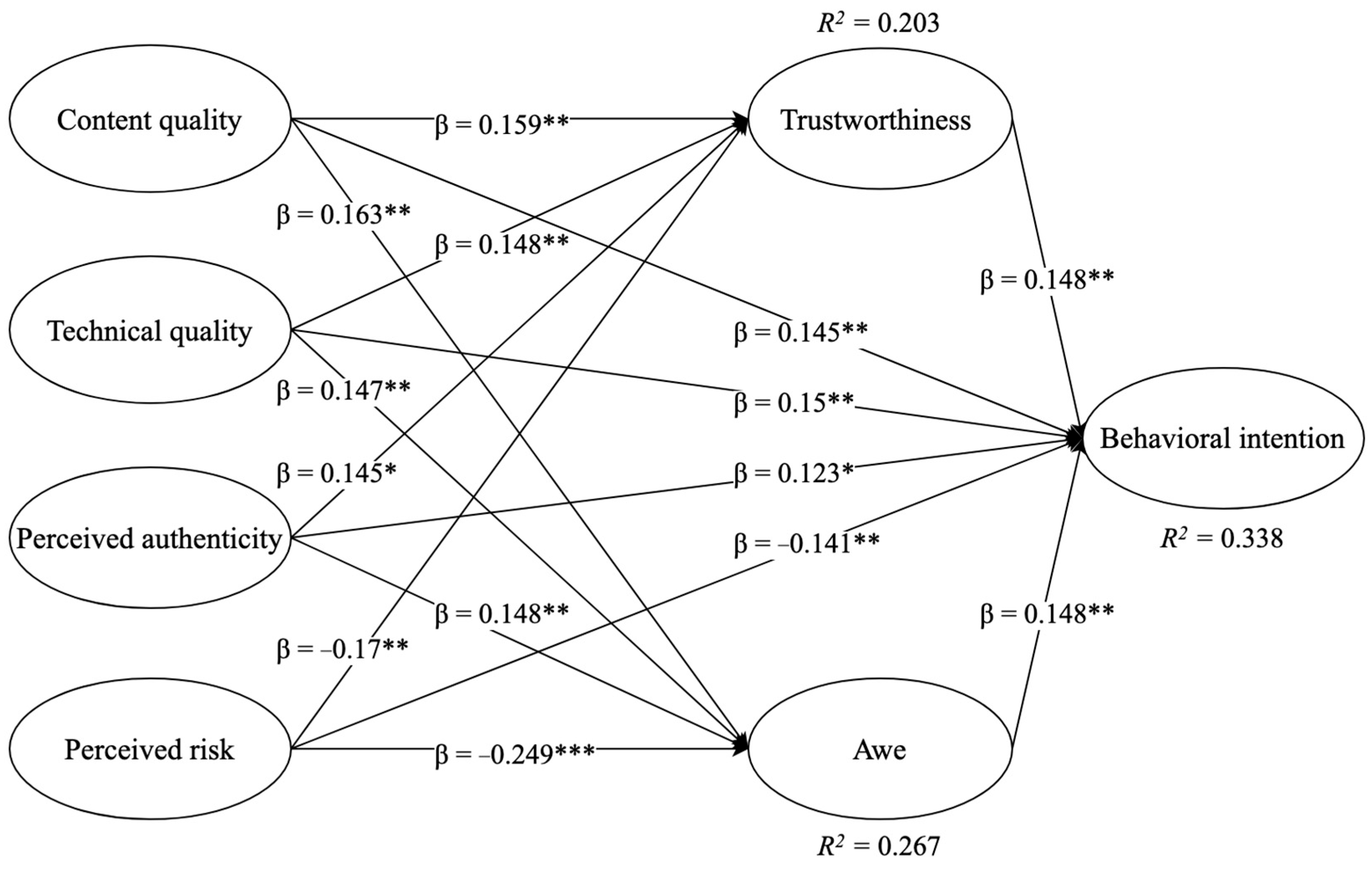 Trustworthiness mediated the negative relationship between perceived risk and behavioral intention (β = −0.025, p < 0.05), supporting H17b. However, the mediating effects of content quality (β = 0.023, p = 0.059), technical quality (β = 0.022, p = 0.07), and perceived authenticity (β = 0.021, p = 0.054) on behavioral intention were not significant, thus rejecting H15a, H15b, and H17a, respectively. Conversely, awe significantly mediated the positive relationships between content quality (β = 0.024, p < 0.05; H16a supported) and technical quality (β = 0.022, p < 0.05; H16b supported) and behavioral intention, while also mediating the negative relationship between perceived risk and intention (β = −0.037, p < 0.05; H18b supported). Awe showed no significant mediation between perceived authenticity and behavioral intention (β = 0.022, p = 0.055), rejecting H18a. The results are presented in Table 4.