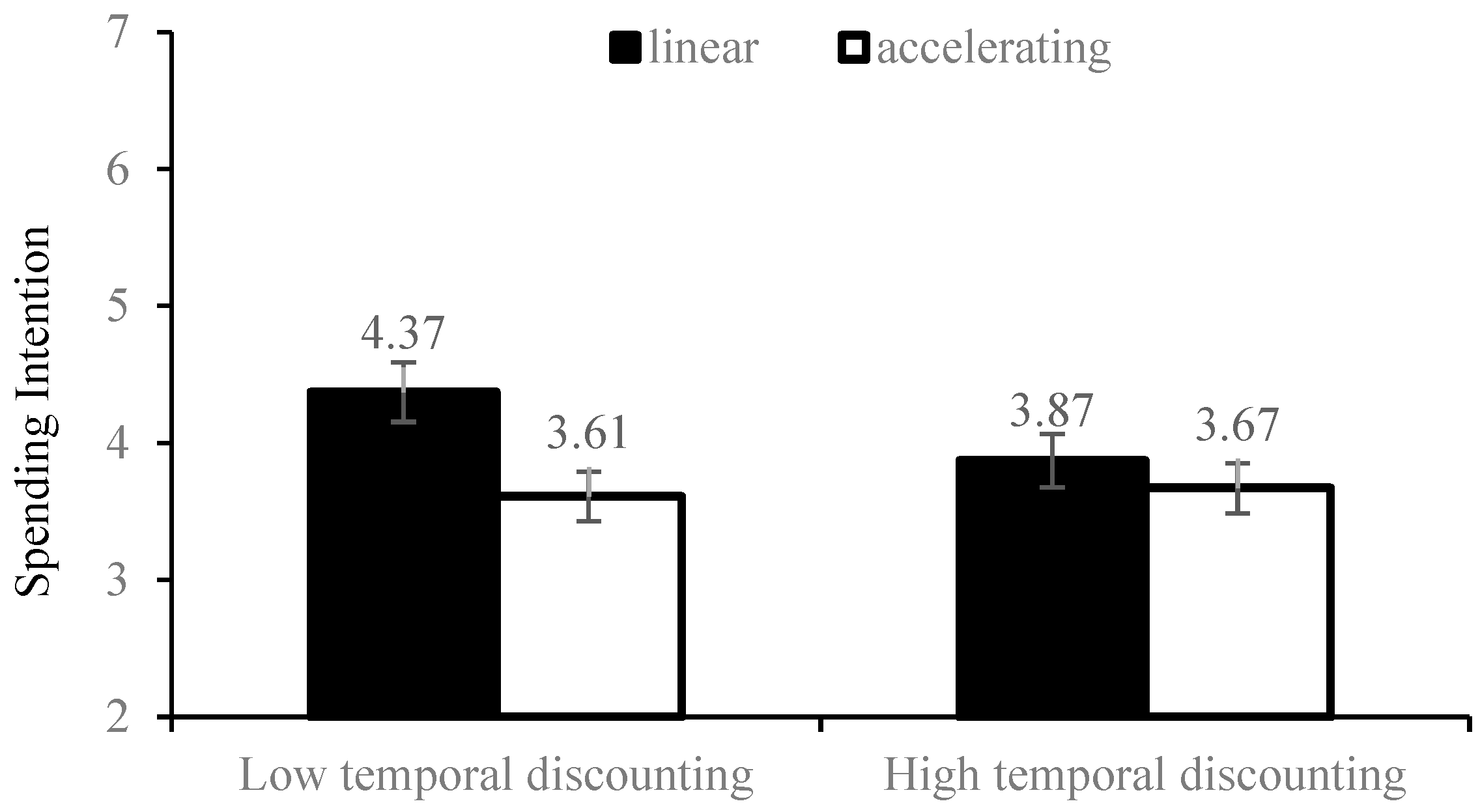 | Study 3 | 400 (Prolific) | 2 (Linear vs. Accelerating Points Framework) × 2 (High vs. Low Temporal Discounting) | Examine how temporal discounting moderates the effect of points framework on spending intentions (H3) | Lower temporal discounting consumers showed higher spending intentions under the accelerating framework. |
