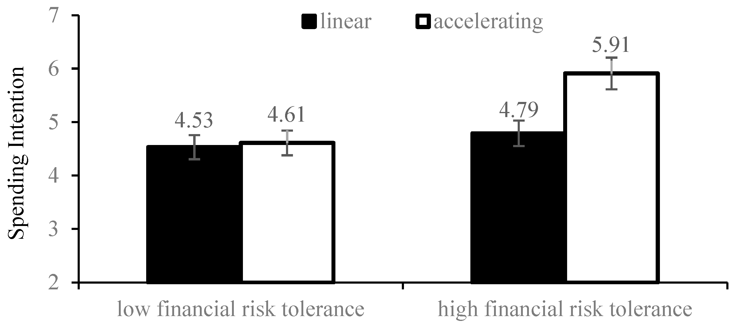 | Study 4 | 400 (Prolific) | 2 (Linear vs. Accelerating Points Framework) × 2 (High vs. Low Financial Risk Tolerance) | Investigate how financial risk tolerance moderates the impact of points accumulation framework on spending intentions (H4) | High-risk tolerant consumers showed higher spending intentions in the accelerating points condition, while low-risk tolerant consumers showed no significant difference. |