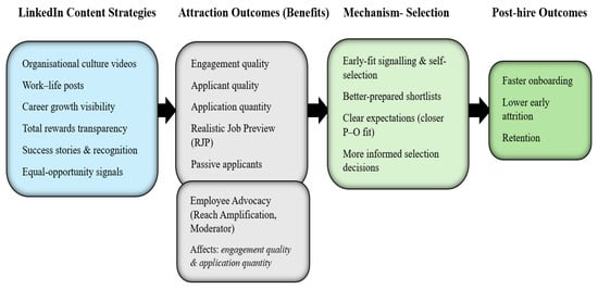 The model introduces an early-fit mechanism that explains how these outcomes transition into the recruitment and selection phases. Candidates exposed to authentic LinkedIn content engage in self-selection, arrive better prepared, and demonstrate clearer expectations and closer person-organisation (P-O) fit, leading to more informed selection decisions. Employee advocacy, represented by staff reposts and network engagement, functions as a reach-amplification moderator that enhances both engagement and application volume. The downstream post-hire outcomes, faster onboarding, lower early attrition, and higher retention, highlight the sustained effect of digital employer branding.