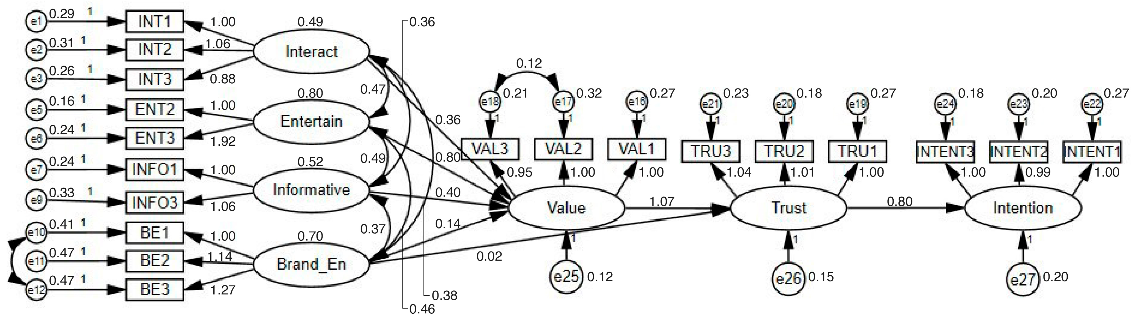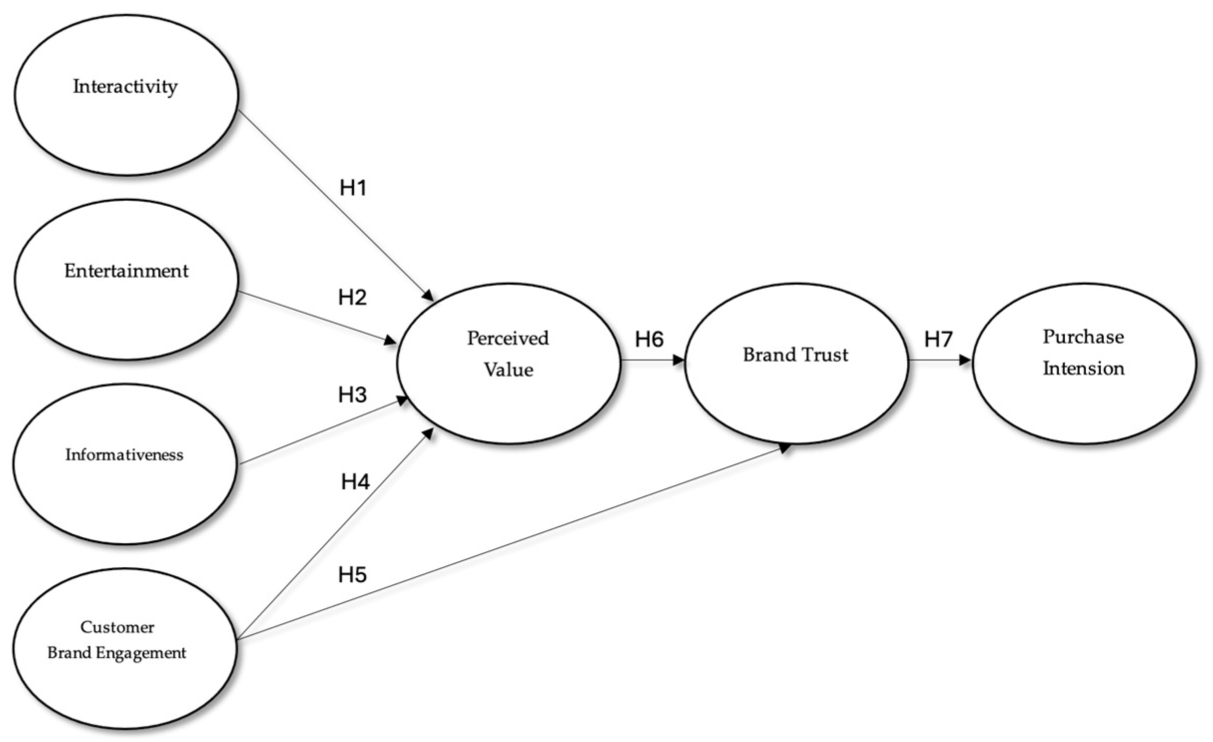 27], these three variables represent the experiential stimuli that drive consumers’ cognitive and affective evaluations—specifically perceived value and brand trust—which ultimately influence purchase intention within the TikTok advertising context.