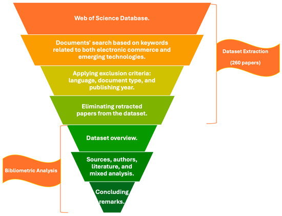 The paper is organized into six distinct sections. Section 1, is focused on offering an overview of the research domain, providing general details about electronic commerce emerging technologies, and highlighting the importance of integrating them so as to optimize platforms and processes and to enhance users’ experience and satisfaction. Section 2 presents the analysis steps, more specifically how the data was collected the plan for the bibliometric investigation, along with the tools and materials involved. Section 3 consists of the actual bibliometric analysis, in which the previously collected dataset is examined in depth from multiple perspectives. Section 4 presents all the insights exposed in the analysis phase and compares them with other bibliometric studies. Also, the main research directions identified in the dataset are discussed in connection with the selected papers. Section 5 provides an objective perspective of the work performed in this article, discussing the aspects that should be considered for future research directives. Section 6 underlines once again the work performed in this paper, summarizes the main ideas, highlights the need for continuous research, and emphasizes the importance of integrating emerging technologies in electronic commerce platforms so as to offer customers a safe and efficient shopping experience.