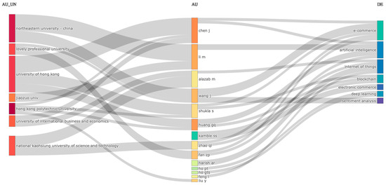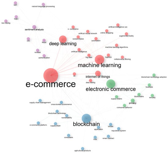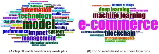 The initial query returned a number of 14,644 works that include in their title keywords related to electronic commerce (“e-commerce” and “electronic commerce”). The next query filtered through the documents and returned 351,153 papers that have in their title one of the keywords related to emerging technologies (“artificial intelligence”, “machine learning”, “blockchain”, “Internet of Thing”, “emerging technology”, “deep learning”, “distributed ledger technology”, and “augmented reality”). The last query intersected the two previously obtained results, obtaining a total of 426 papers that address exclusively a topic around the area of e-commerce, together with emerging technologies.