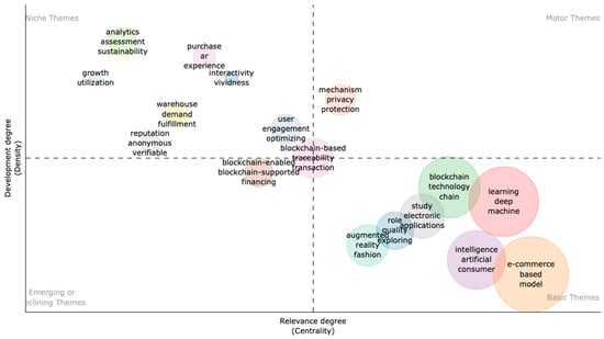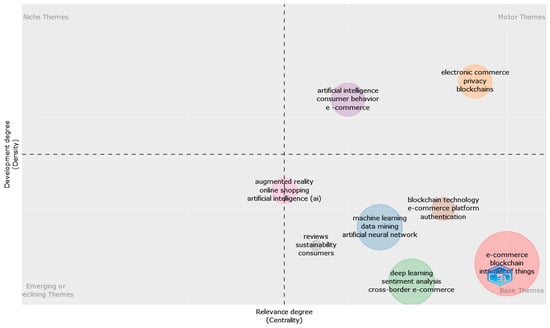 While some of the papers in Table 1 offer valuable insights into e-commerce, it can be observed that in the area of emerging technologies, the selected studies focus mainly on a single emerging technology within the e-commerce field—e.g., blockchain [16], AI [17,18,19], recommender systems [20,21], ML [22,23]. Therefore, these studies provide limited visibility into how different emerging technologies intersect and co-evolve in the broader e-commerce research landscape. Moreover, as highlighted above, considering the analyses conducted in the above-mentioned studies, these are limited to classical bibliometric analyses focusing on statistics related to the number of papers, authors characteristics, sources analyses, not providing or revealing thematic patterns through the use of multi-faceted approaches, such as thematic maps combined with either LDA or BERTopic analyses.