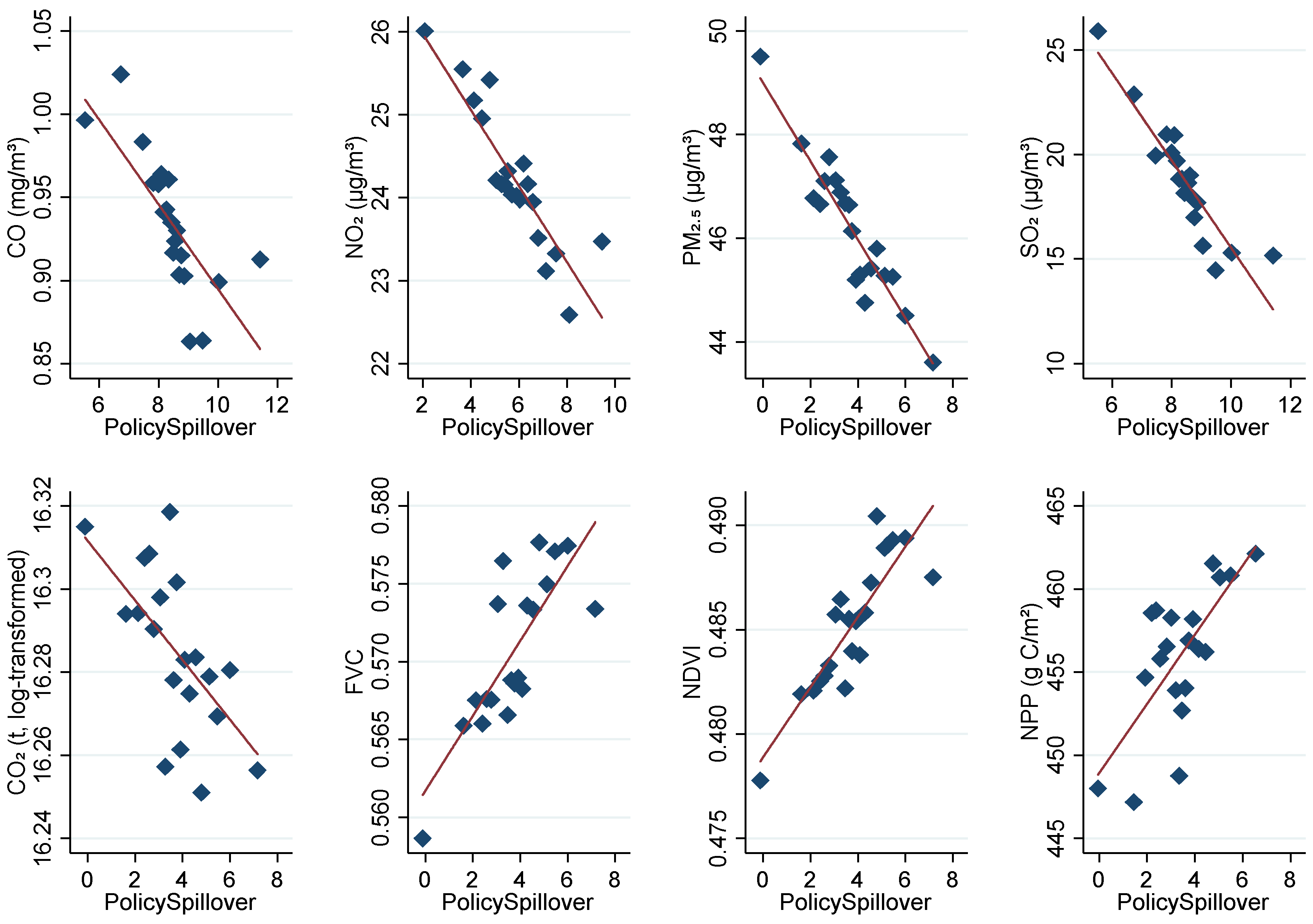 | (b) Use alternative spatial weights matrix W[0, 1000km] | PolicySpillover | −0.0864 *** | −0.881 *** | −3.107 *** | −5.625 *** |