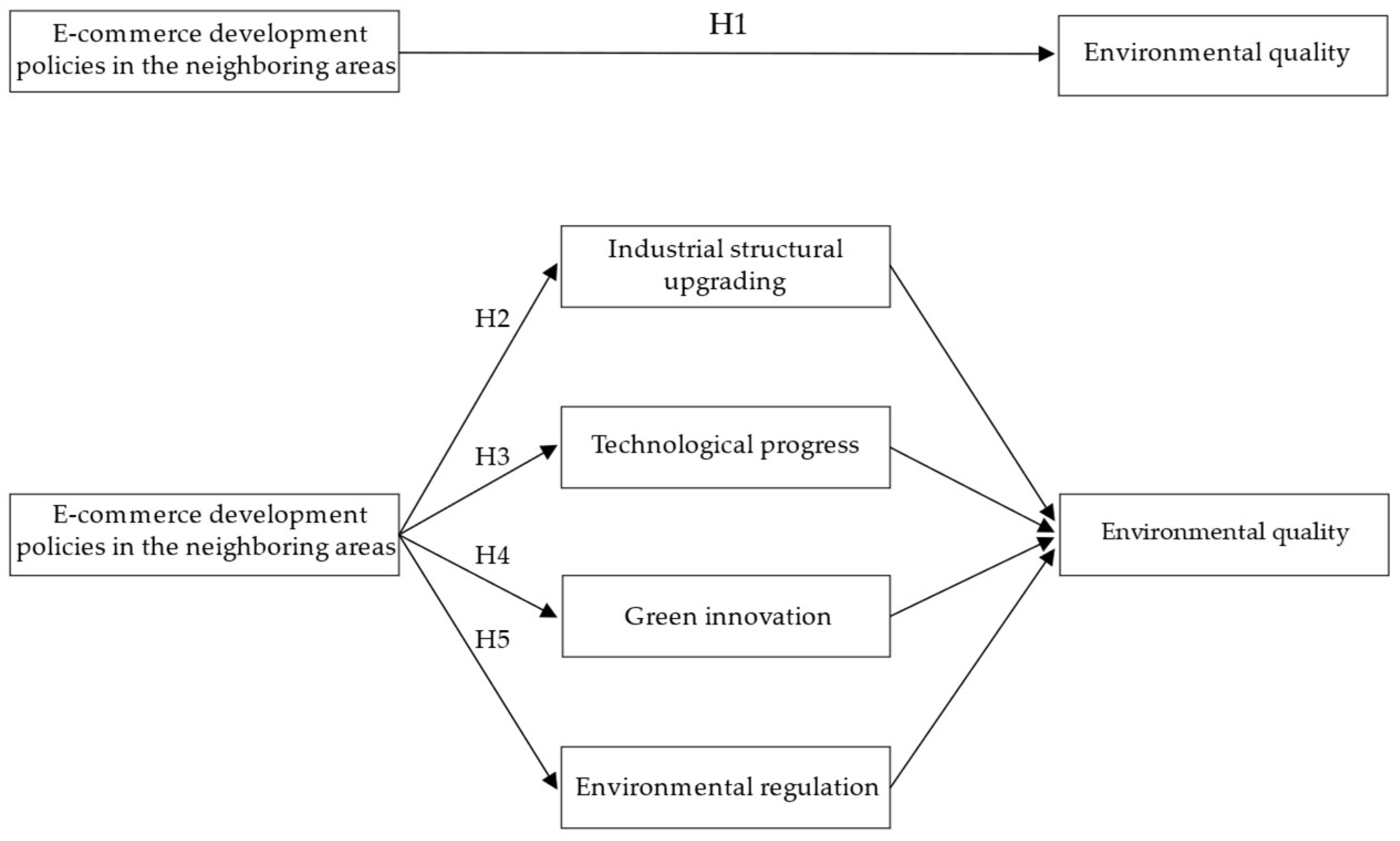 - E-commerce may promote industrial structure upgrading in other regions. By integrating regional value chains, e-commerce enables different areas to engage in more refined specialization based on their comparative advantages. Furthermore, e-commerce platforms create a unified national market, intensifying competition among enterprises across regions and compelling them to transform. Industrial structure upgrading enhances the efficiency of economic activities, reducing resource consumption and waste, thereby improving environmental quality. Based on the above logic, we propose the following research hypothesis: