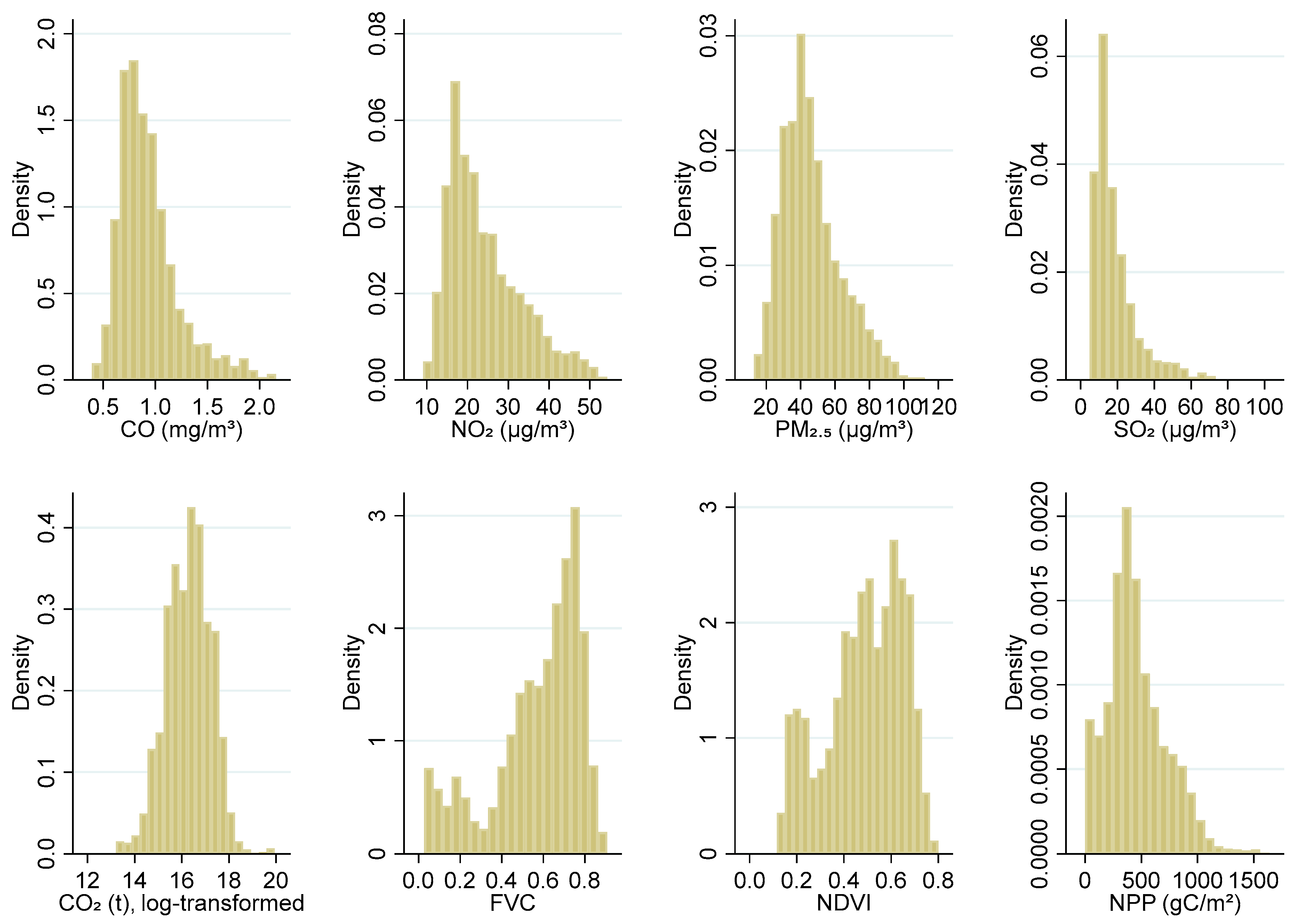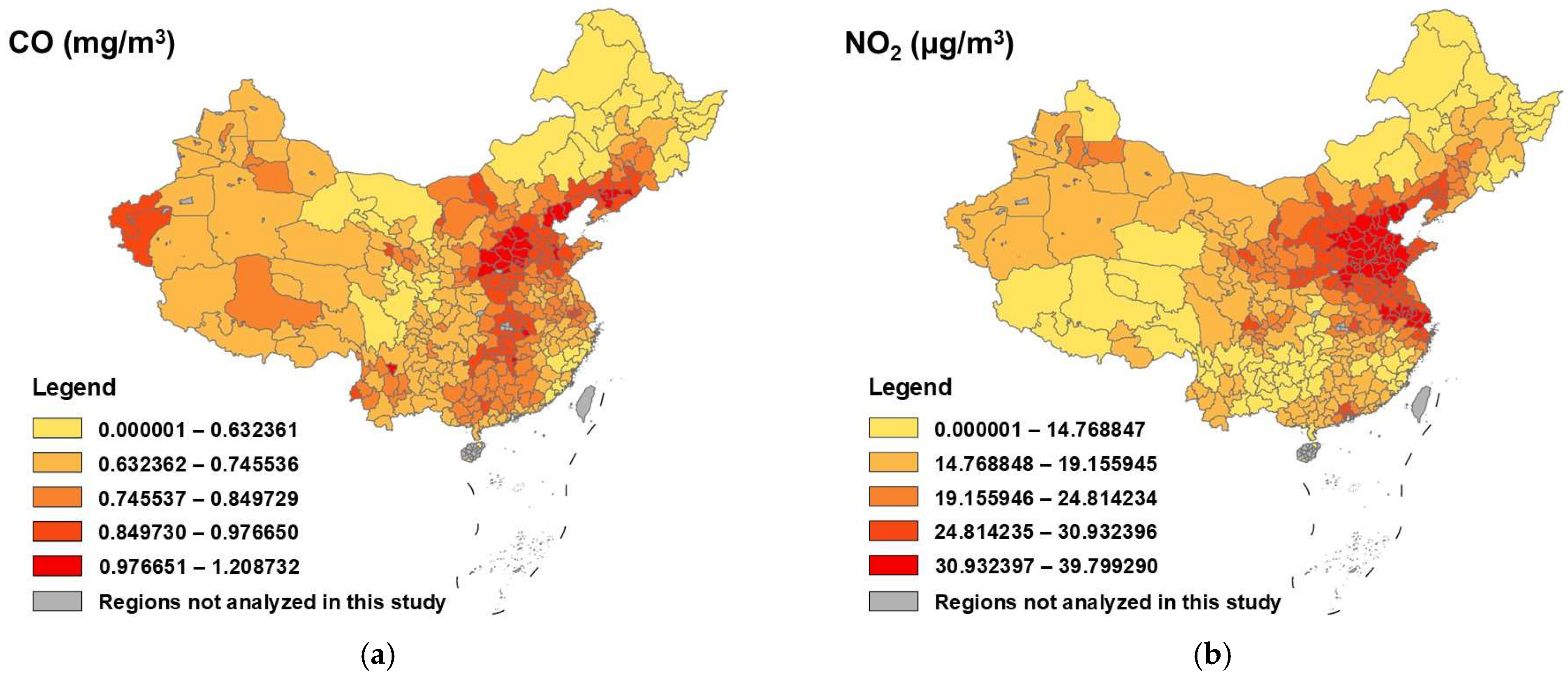 - Air quality, represented by four indicators: the concentrations of four air pollutants—CO, NO2, PM2.5, and SO2—in ambient air. Higher concentrations of these pollutants indicate more severe air pollution and poorer air quality.