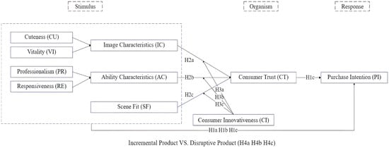 To answer the above questions, this study adopts the SOR (stimulus–organism–response) model to investigate how AI streamers’ characteristics and live-streaming scenarios impact purchase intention. This study contributes in four ways: First, existing research on AI streamers centers on streamer characteristics and product attributes [,,]. However, live-streaming e-commerce evidence shows that streamers, products, and scenario fit critically affect purchase intention. Consequently, this study introduces the variable of live-streaming scenarios into the research framework. Second, current research emphasizes social attributes and functional capabilities (e.g., empathy, perceived closeness, satisfaction, and social presence) in AI live-streaming e-commerce [,] but neglects consumer trust. However, studies on human streamers confirm trust’s importance [,,]. This study therefore examines how AI streamers’ characteristics and scenarios influence purchase intention through consumer trust. Third, in live-streaming commerce, product differentiation and consumer innovativeness significantly influence consumer trust. Hence, this study explores how product consumer innovativeness moderates the impact of AI streamers on consumer trust. Moreover, the type of product innovation has a significant difference in the impact of AI streamers on consumer trust. Fourth, this study combines SEM with fsQCA to validate the model’s logic and identify the multiple pathways.