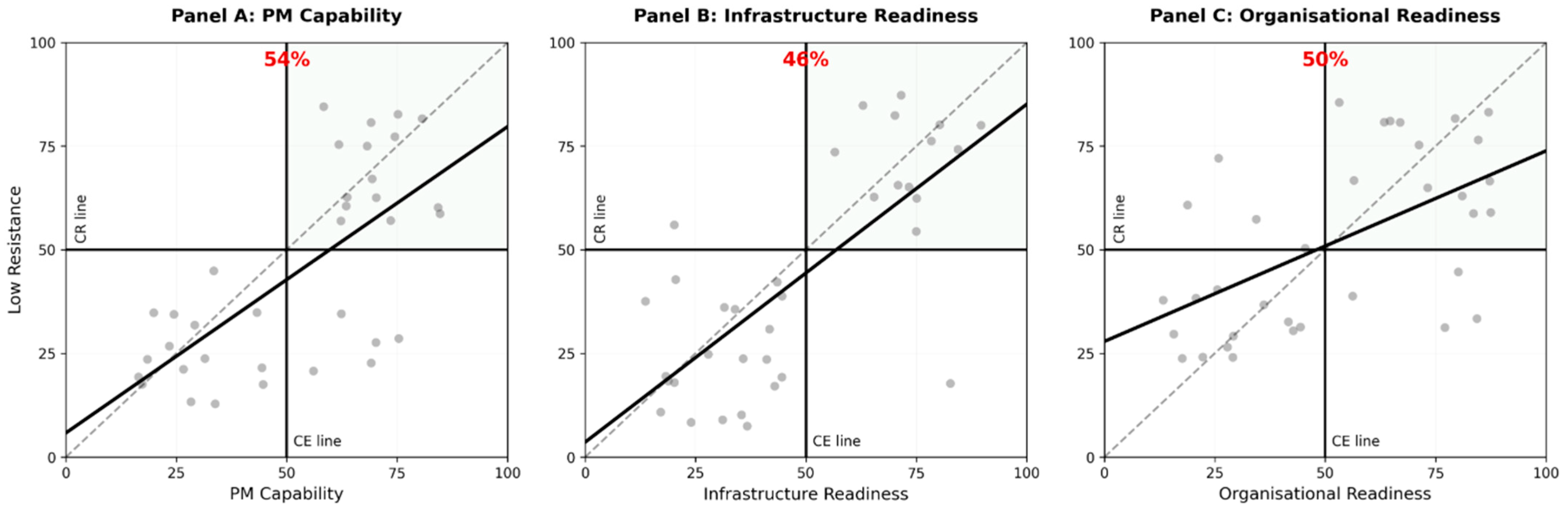 | Low resistance | Org readiness | 0.22 ** | 0.20 ** | 3.5 (50%) |