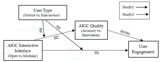 How human–AI interactive interfaces affect user engagement with AIGC platforms is a critical underexplored issue. Grounded in signaling theory, this paper constructs a theoretical model to examine the differential effects of two interactive interfaces—modular versus open—on user platform engagement, the mediating role of AIGC quality, and the moderating role of user type. Through two scenario experiments, our findings reveal that both AI interactive interfaces (open and modular) significantly enhance user platform engagement, with the open interface exhibiting a stronger effect. Specifically, AIGC accuracy serves as a mediator in the relationship between modular interfaces and user engagement, and innovativeness plays a mediating role in the relationship between the open interface and users’ engagement. Furthermore, novice users strengthen the effect of open AIGC interfaces on AIGC innovation and subsequent engagement, Non-novice users amplify the positive impact of modular AIGC interfaces on both AIGC accuracy; however, there is no significant difference for user engagement. These findings theoretically enrich the customer response model in the literature on human–computer interactions and provide actionable insights for AIGC platform enterprises. By designing tailored interactive interfaces, platforms can generate high-quality, user-perceived AIGC for diverse customer segments. This study offers both theoretical contributions and practical implications for the development of AI-driven user engagement strategies.