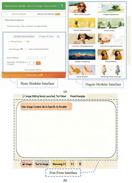 (a) A modular interface (Lingtu). Note: From Lingtu by China Xiamen Lingtu Technology Co., Ltd. https://www.lingvisions.com/ (accessed on 10 October 2025). Copyright by Lingtu Technology Co., Ltd. (b) An open interface (Tongyi Wanxiang). Note: From China Hangzhou Tongyi Wanxiang by Aliyun. https://tongyi.aliyun.com/wan/generate/image/text-to-image?model=wan2.5 (accessed on 10 October 2025). Copyright by Aliyun.