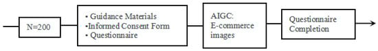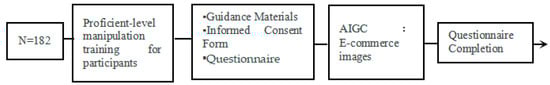The detailed process is illustrated in Figure 3. The participants were restricted to completing the experiment on the PC, independently reading the text materials, designing the AI content, and completing the questionnaire survey. After reading and signing an informed consent form, the subjects were randomly assigned to two condition groups. At the beginning of the experiment, the participants first read the following “Welcome…” instructions on a PC-independent interface (displayed using PowerPoint): “Later you will see an introduction of a pastry company, please imagine yourself as a designer for the e-commerce promotion images of the company”. Image design was selected as the experimental task because the image name, color, font, and design can be presented on both modular and open interfaces []. After the introduction, the participants were asked to read a paragraph containing information about a company, including its business area, representative products/services, and company culture (shown in Appendix A). The company was fictitious to avoid brand associations.