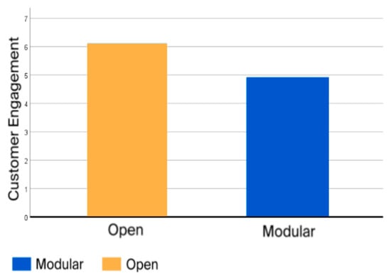 The effects of the AIGC interface (modular vs. open) on user engagement were examined. An independent sample t-test was conducted, with the AIGC interface (modular vs. open) as the factor and user engagement as the dependent variable. The analysis results show that there are significant differences in user engagement between the two AIGC interactive interface modes (Mmodular = 4.903, Dmodular = 0.933; Mopen = 6.117, Dopen = 0.730, F = 104.824, p < 0.01, η2 = 0.346), indicating that the AIGC interactive interface (modular vs. open) has a significant impact on user engagement, and user engagement under the open AIGC interactive interface is higher than that under the modular AIGC interactive interface (Figure 4). Therefore, hypothesis H1 is true.