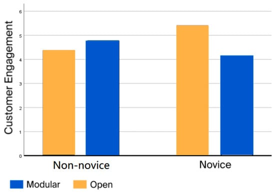 One-way ANOVA showed that among novice users, the user engagement of the open AIGC interactive interface group was significantly higher than that of the modular AIGC interactive interface group (Mmodular = 4.14, Mopen = 5.41; F (1,92) = 32.032, p < 0.001, η2 = 0.262). Among non-novice users group, there was no significant difference in user engagement between the modular AIGC interface group and the open interface group. (Mmodular = 4.77, Mopen = 4.37; F (1,90) = 3.017, p = 0.086, η2 = 0.033). Thus, we conclude that H5 has received support for novice users. For non-novice users, although the experimental results were not significant (p = 0.086), the mean value of the modular interface (4.77) is higher than that of the open interface (4.37), which means the trend is consistent with the original hypothesis. The above conclusions are shown in Figure 6.
