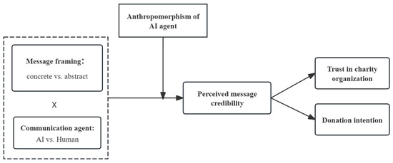 Drawing on trust transfer theory, when consumers perceive consistent and frequent interaction between two related entities, trust in a familiar target may transfer to an unfamiliar one [52]. Recent research in interactive marketing supports this logic, showing that consumers’ trust in an influencer account can transfer to the posts it generates [15]. Applying this theoretical notion to human–AI interaction in online fundraising, the AI chatbot can be regarded as the familiar target, while the credibility of the message delivered by the chatbot serves as a perceptual conduit for trust transfer. In this process, consumers’ confidence in the accuracy and authenticity of AI-generated messages can shape their subsequent trust in the charitable organization behind the communication. Unfortunately, extant literature has largely focused on technological trust in AI systems, while overlooking this potential trust transfer mechanism from AI-mediated information to nonprofit organizations. Therefore, the second focus of this research is to examine how different types of message framing influence consumers’ perceived message credibility during human–AI chatbot interaction, and how this perception subsequently affects their trust and donation intention toward charitable organizations.