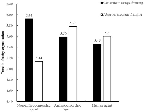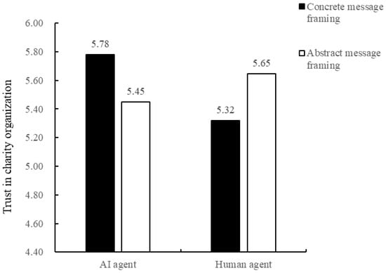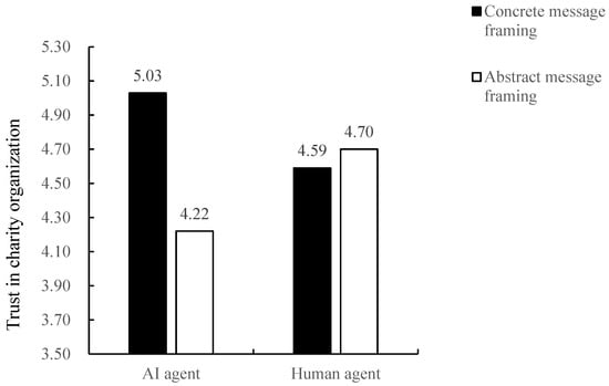 To examine the interaction effect between communication agent type and message framing, a two-way ANOVA was conducted with agent type (AI = 1, human = 0) as the independent variable and message framing (concrete = 1, abstract = 0) as the moderator. The dependent variable was trust in the charitable organization. The analysis revealed a significant interaction effect on organizational trust (F(1, 295) = 7.332, p = 0.007, η2 = 0.017), whereas the main effects of communication agent and message framing on trust were both not significant. Specifically, when the agent was AI, participants in the concrete framing condition reported significantly higher trust than those in the abstract condition (Mconcrete = 5.840, SD = 0.736 vs. Mabstract = 4.973, SD = 1.377; F(1, 148) = 28.167, p < 0.001, η2 = 0.135). Conversely, when the agent was human, trust did not differ significantly between concrete and abstract framing conditions (Mabstract = 5.215, SD = 1.153 vs. Mconcrete = 5.382, SD = 1.107; F(1, 147) = 0.814, p = 0.369). Additionally, under concrete framing, participants in the AI condition reported higher trust than those in the human condition (Mai = 5.840, SD = 0.736 vs. Mhuman = 5.382, SD = 1.107; F(1, 149) = 8.953, p = 0.003, η2 = 0.057), whereas under abstract framing, trust did not differ between AI and human agents (Mhuman = 5.215, SD = 1.153 vs. Mai = 4.973, SD = 1.377; F(1, 146) = 1.332, p = 0.250). These results provided further support for Hypothesis 1a.