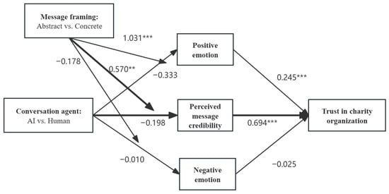 A moderated mediation analysis was conducted using the PROCESS macro (Model 7), with message framing as the independent variable, perceived source credibility as the mediator, trust in the charitable organization as the dependent variable, and communication agent type as the moderator. Bootstrapping with 5000 resamples was employed. The index of moderated mediation was significant (index = 0.578, SE = 0.220, 95% CI [0.140, 1.026]), indicating that the indirect effect of message framing on trust through perceived source credibility depended on the type of communication agent. Specifically, there was a significant interaction between communication agent and message framing on perceived source credibility (b = 0.570, SE = 0.218, 95% CI [0.140, 1.000]). For the AI agent condition, participants exposed to concrete message framing reported significantly higher perceived source credibility than those in the abstract condition (b = 0.680, SE = 0.154, 95% CI [0.377, 0.983]). In contrast, for the human agent condition, message framing did not significantly affect perceived source credibility (b = 0.110, SE = 0.155, 95% CI [−0.195, 0.414]). Consequently, when the agent was AI, concrete framing increased trust in the charitable organization via enhanced perceived source credibility (indirect effect b = 0.690, SE = 0.161, 95% CI [0.391, 1.026]). However, this indirect effect was not significant when the agent was human (indirect effect b = 0.111, SE = 0.157, 95% CI [−0.198, 0.426]). These results provide preliminary support for Hypothesis 2a.