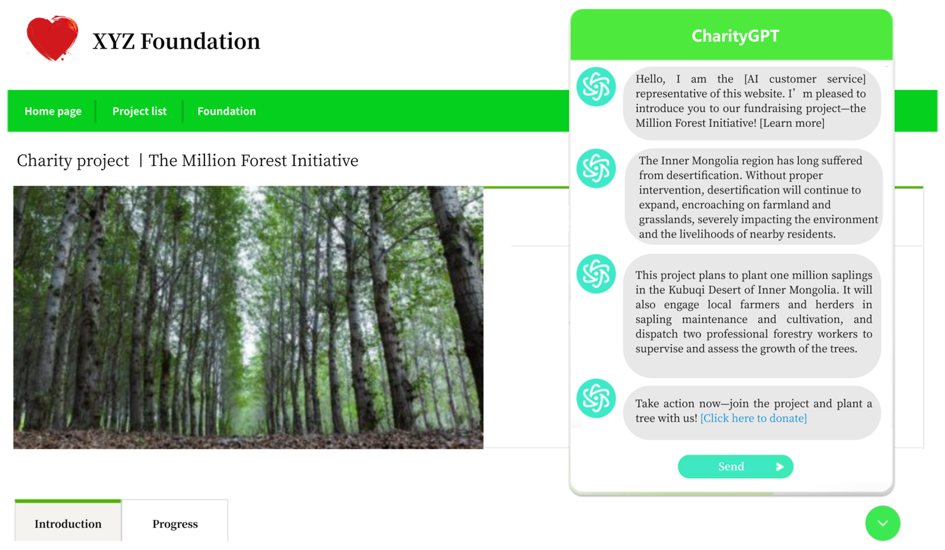 “Hello, I am the [AI customer service] representative of this website. I’m pleased to introduce you to our fundraising project—the Million Forest Initiative! [Learn more] The Inner Mongolia region has long suffered from desertification. Without proper intervention, desertification will continue to expand, encroaching on farmland and grasslands, severely impacting the environment and the livelihoods of nearby residents. This project plans to plant one million saplings in the Kubuqi Desert of Inner Mongolia. It will also engage local farmers and herders in sapling maintenance and cultivation, and dispatch two professional forestry workers to supervise and assess the growth of the trees. Take action now—join the project and plant a tree with us! [Click here to donate]”