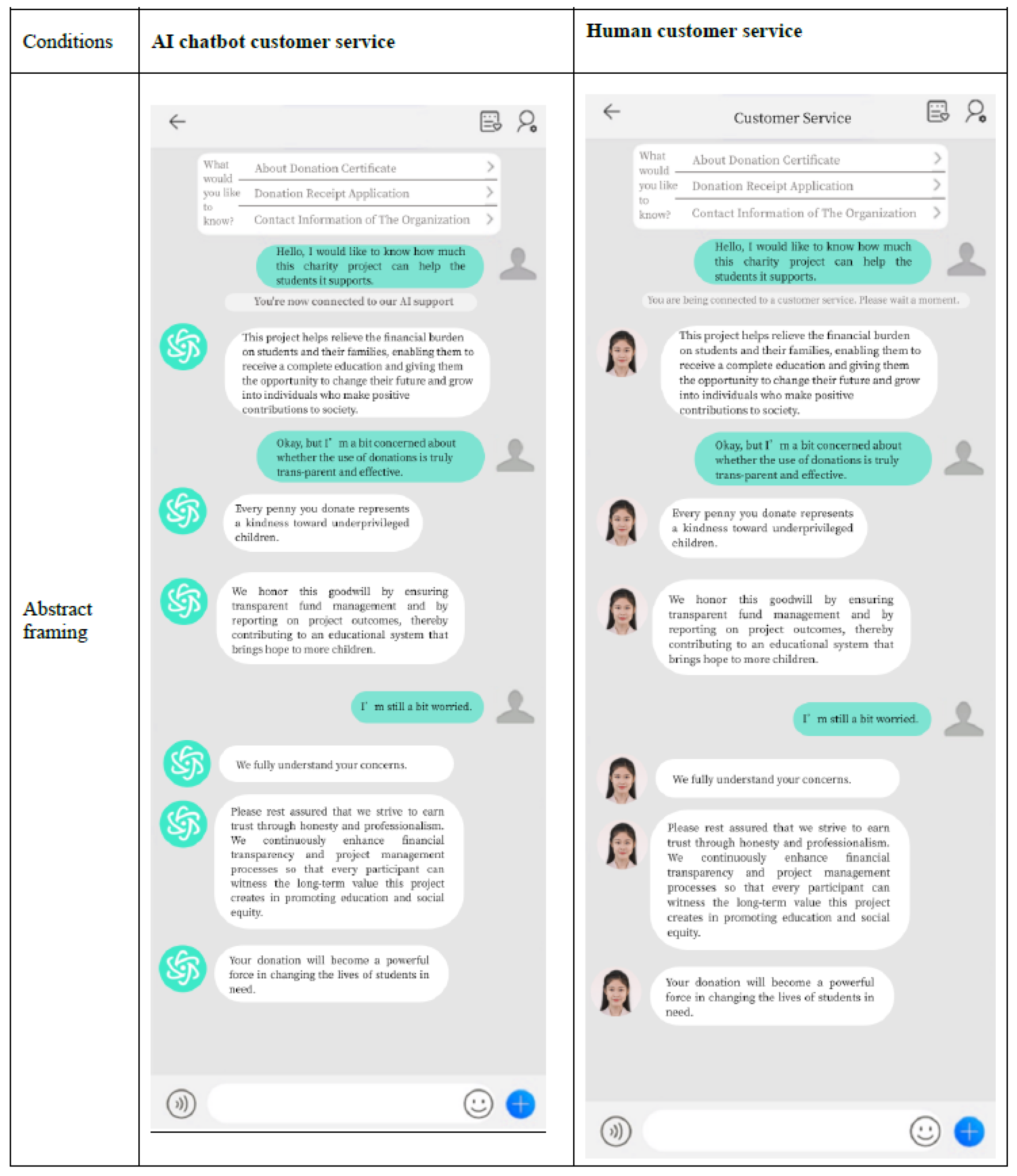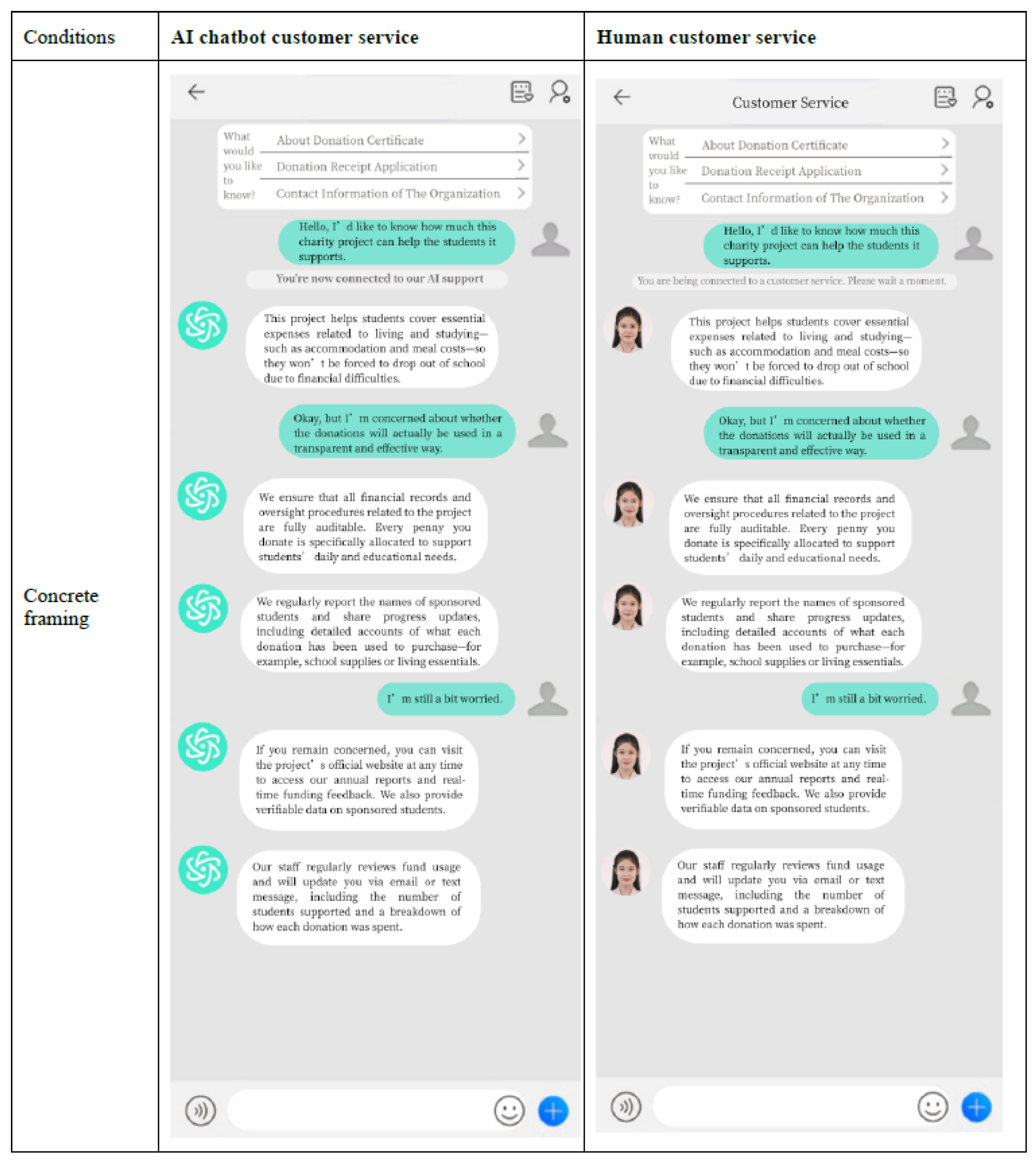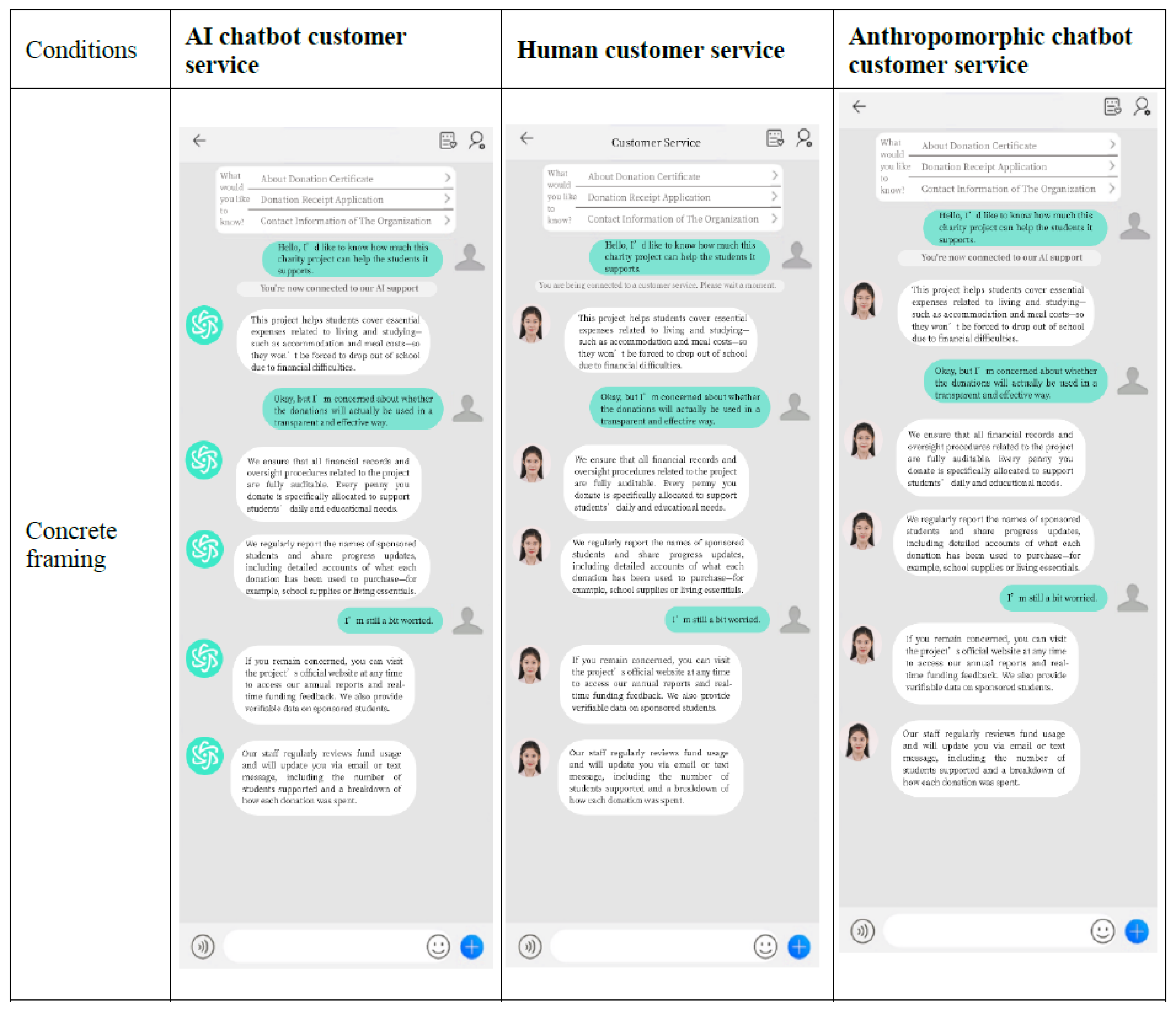 | H1b: When the communication agent is an AI chatbot (vs. a human), using concrete (vs. abstract) message framing will more effectively enhance consumers’ donation intention. | effect size (η2) | 0.022 | 0.014 | 0.019 | ☐ |