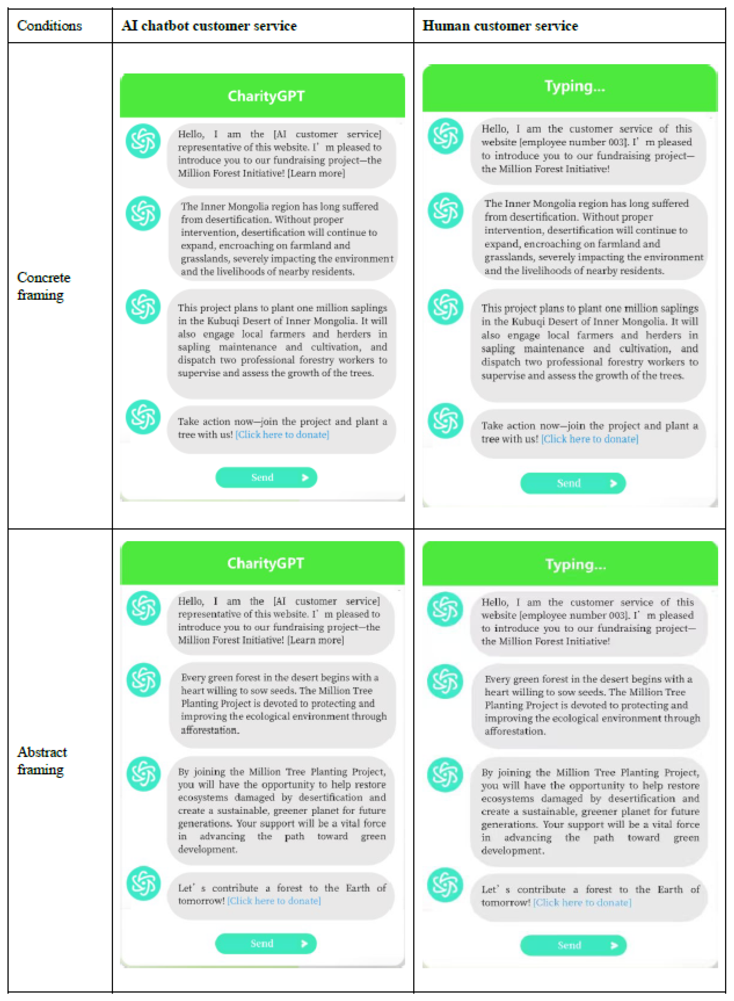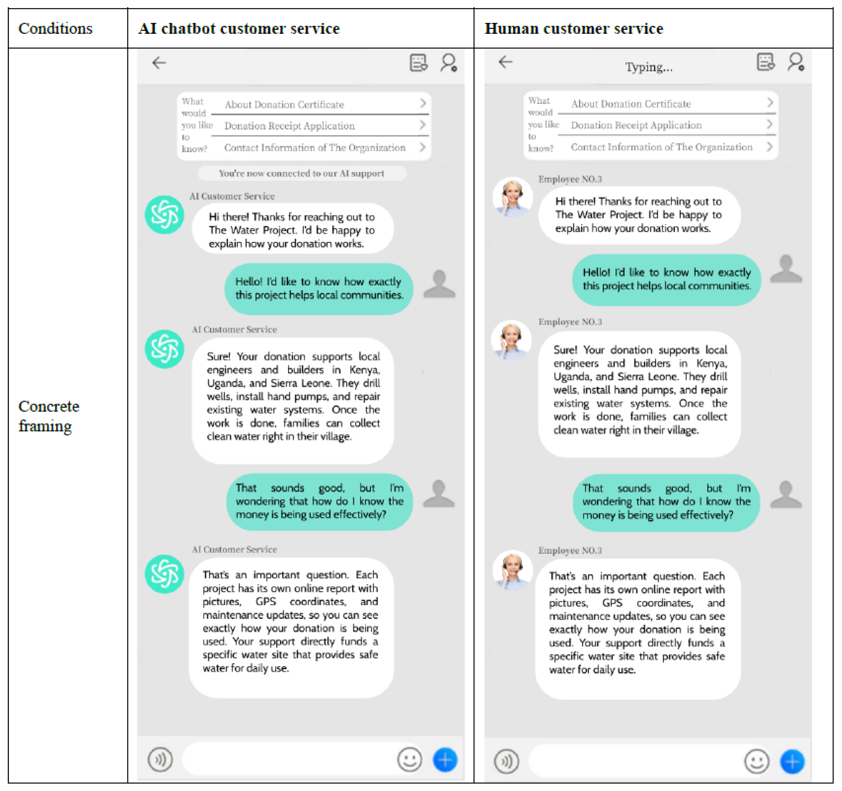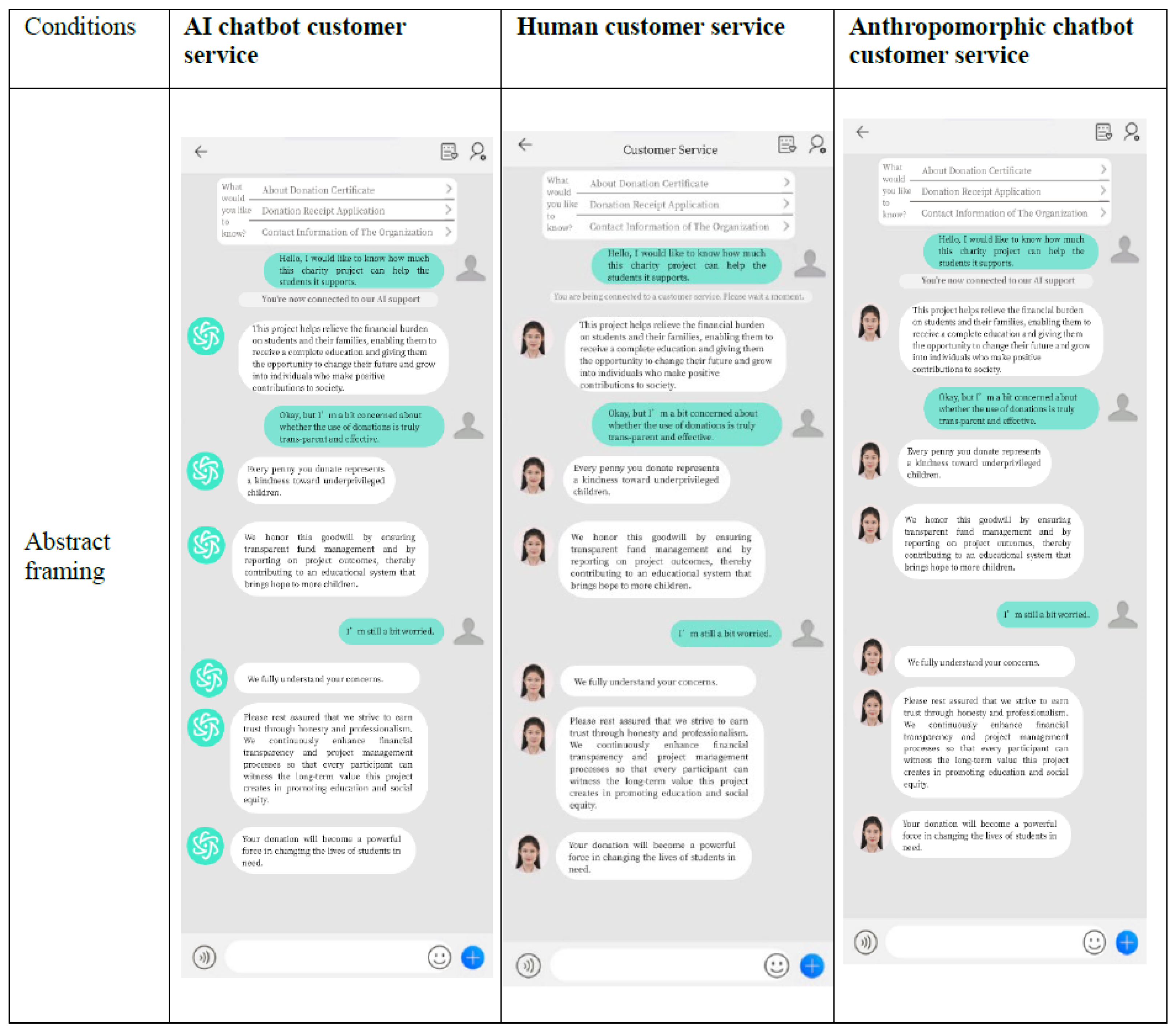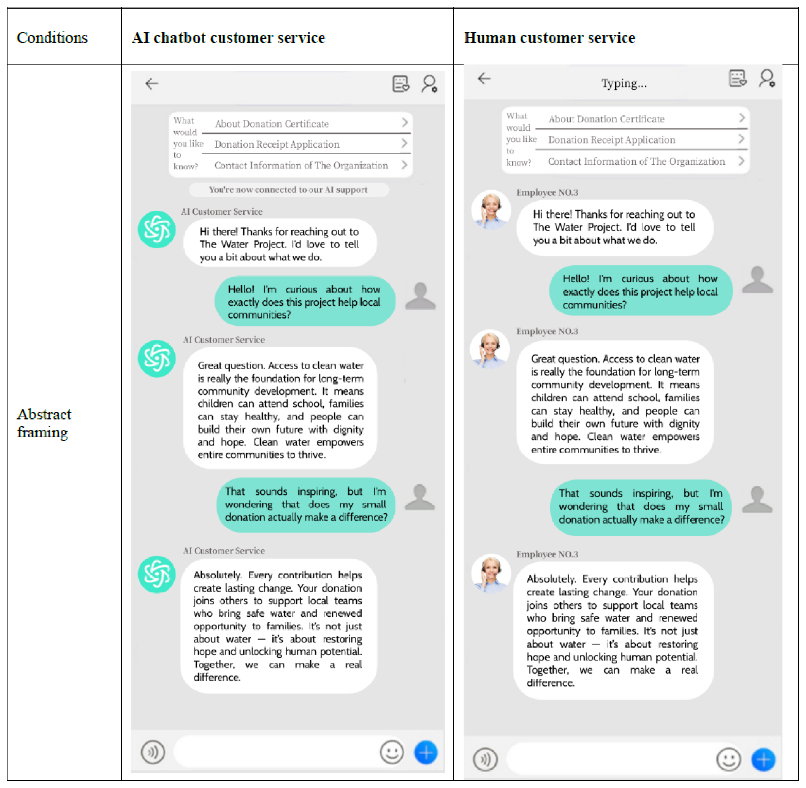 | H1b: When the communication agent is an AI chatbot (vs. a human), using concrete (vs. abstract) message framing will more effectively enhance consumers’ donation intention. | effect size (η2) | 0.022 | 0.014 | 0.019 | ☐ |