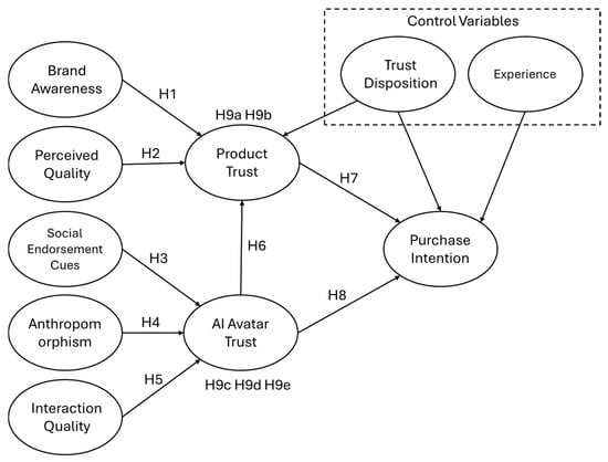 Research model. Note: H9a–H9e represent the indirect (mediated) effects of brand awareness, perceived quality, social endorsement cues, anthropomorphism, and interaction quality via product trust and AI Avatar trust.