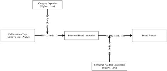 However, this signal translation is not automatic. Consumers first assess a brand’s underlying motives and competence [15] before updating evaluations. We thus posit perceived brand innovation as a diagnostic appraisal that mediates the effect of collaboration type on brand attitude. Qualitative evidence shows that unexpected partnerships evoke perceptions of “freshness” and “forward thinking” [16], while neurophysiological studies confirm that novelty triggers heightened attention and approach motivation in influencer content [17], supporting innovation as a central mechanism. The moderating roles of need for uniqueness (NFU) and category expertise add critical audience heterogeneity. High-NFU consumers treat distinctive cues as identity resources [18], making them more receptive to cross-niche collaborations. In contrast, category experts engage in confirmatory processing [11] and prefer depth over novelty, unless functional complementarity is clear. This dual-moderator lens answers calls to move beyond one-size-fits-all influencer segmentation [19,20]. Synthesizing these considerations, we propose the following research model: Collaboration Type (same vs. cross niche) → Perceived Brand Innovation → Brand Attitude, with NFU and category expertise moderating the first stage. To test this model, we conduct a 2 × 2 × 2 between-subjects experiment, manipulating collaboration type and systematically varying NFU and category expertise while controlling for message content, influencer status, and sponsorship disclosure. Consistent with ANA [1] guidelines, we also capture behavioral intention metrics (click-through and purchase likelihood) to ensure managerial relevance.