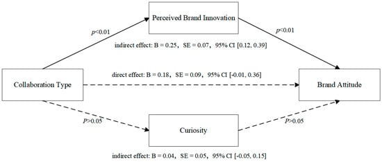 Parallel mediation. Using Hayes [49] PROCESS Model 4 (5000 bootstraps; IV coded 0 = same-niche, 1 = cross-niche), perceived brand innovation and curiosity were entered in parallel. The indirect effect through perceived brand innovation was significant (B = 0.25, SE_boot = 0.07, 95% CI [0.12, 0.39]), while the indirect effect through curiosity was non-significant (B = 0.04, SE_boot = 0.05, 95% CI [−0.05, 0.15]). The total indirect effect was significant (B = 0.27, SE_boot = 0.08, 95% CI [0.12, 0.44]), while the direct effect controlling for both mediators was non-significant (B = 0.18, SE = 0.09, 95% CI [−0.01, 0.36], see Figure 2.). These results indicate that perceived brand innovation fully accounted for the collaboration-type effect, whereas curiosity did not, supporting the proposed mediation while dismissing the alternative explanation.