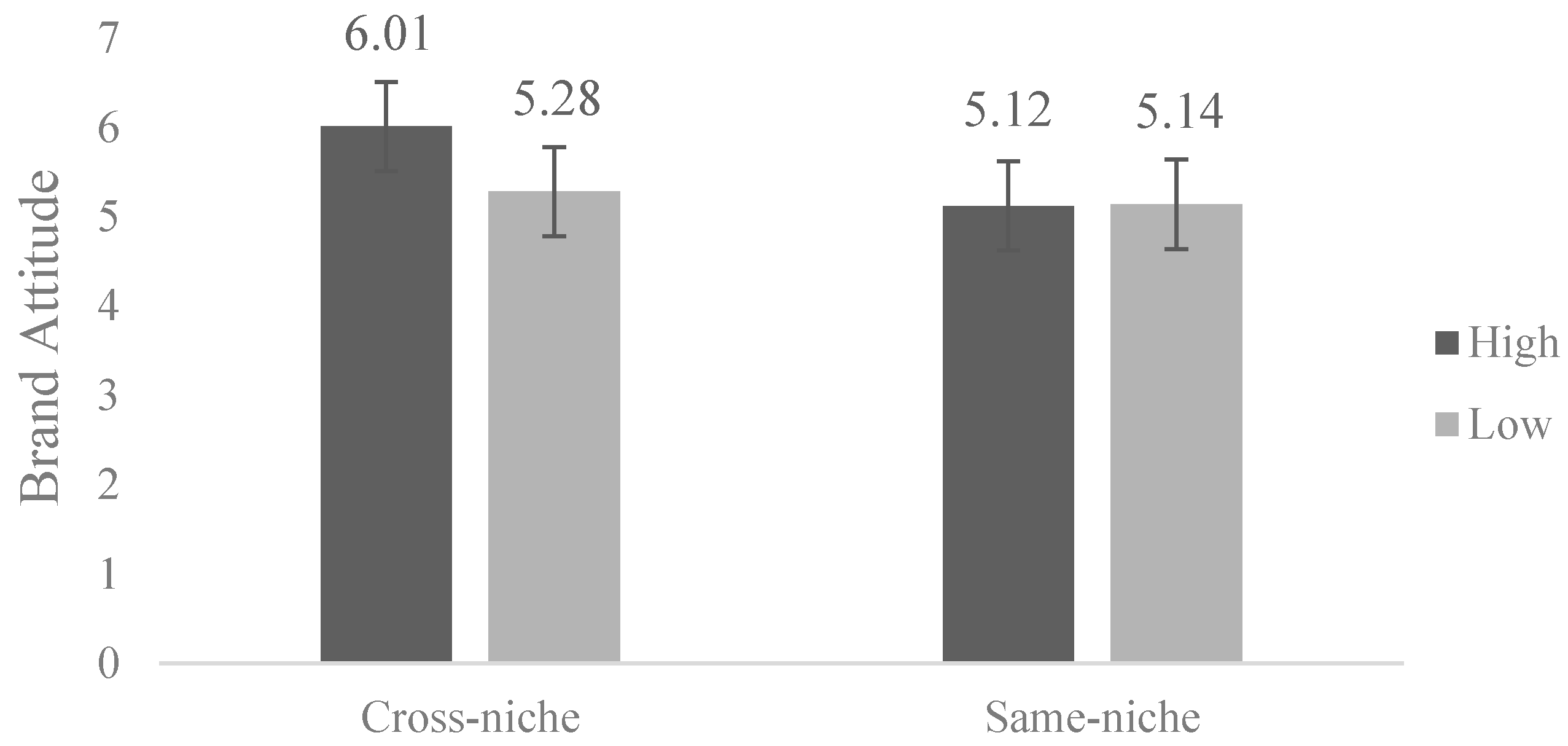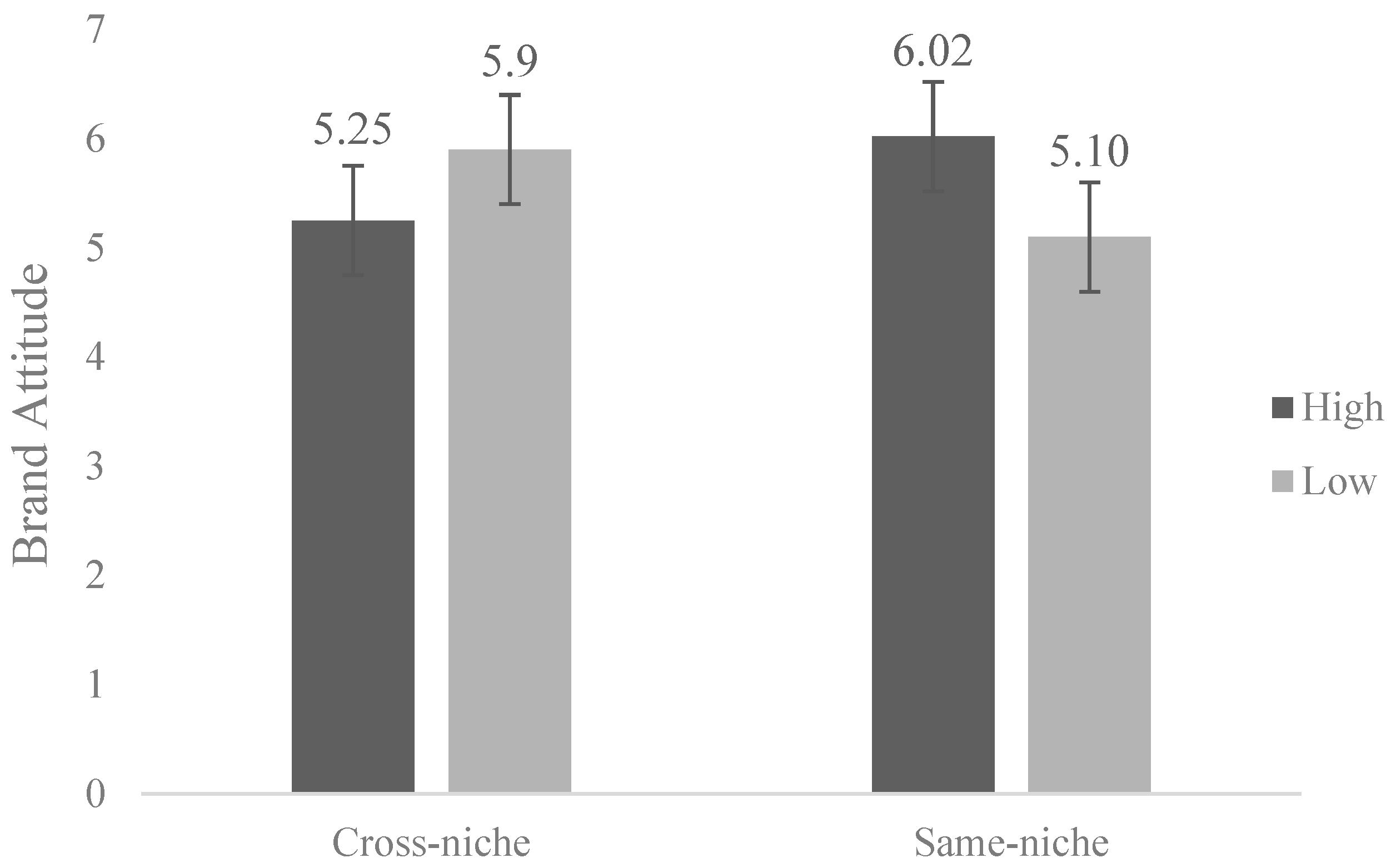 | Study 1 | Same-Niche | 5.39 (1.02) | F(1, 198) = 23.07 (<0.001) | Not Measured | - | Main Effect: Same-niche > Cross-niche |