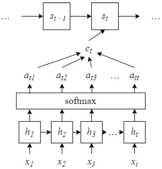 However, the performance of the Seq2Seq model degrades when the input sequence is too long, while the attention mechanism helps the model focus on the parts of the input sequence that are most relevant to the current prediction. The Attention mechanism focuses on contextual information by inputting different c at each time step. Each c performs a weighted summation of information from all hidden layers of the input sequence (h1, h2, …, hₜ) to select the contextual information that is most appropriate for the currently required output y, i.e., , where is the weight. The state output of the decoder at time t is derived from a nonlinear function of the previous state , , and , as shown in Figure 1.