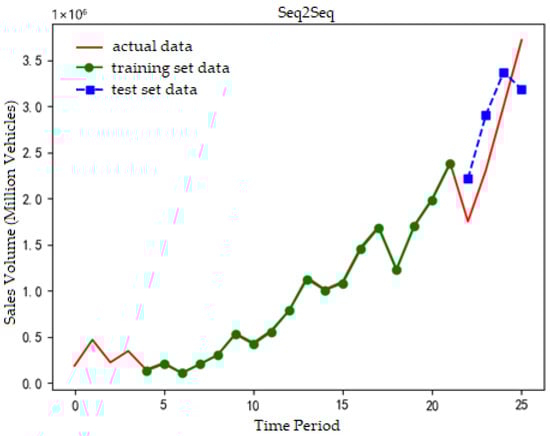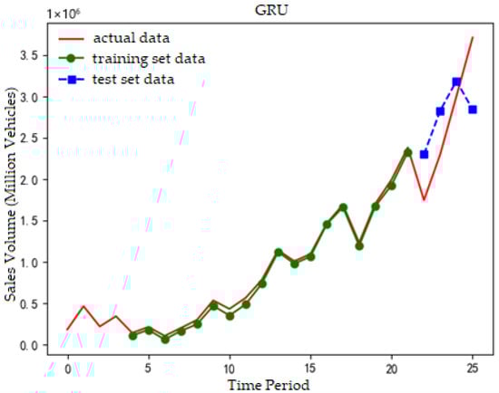 We use the Tensorflow in Python to build a univariate sales prediction model. The quarterly historical sales data is taken as the dataset, and the dataset is divided into the training set and the test set. Considering the data volumes of the training set and the test set, in the data division of the new energy vehicle prediction model, the training set accounts for 85% and the test set accounts for 15%. We establish the GRU neural network, LSTM neural network, CNN neural network, and support vector regression machine. We set random seeds to ensure the reproducibility of the experiment. We make a prediction of the sales volume of new energy vehicles for a certain period as a reference. Considering the convenience of comparison with subsequent models, the parameters are kept as consistent as possible in the model design. The number of neurons in the new energy neural network prediction model is set to 4, the time step is set to 4 (four quarters), and the batch size is set to 1. The support vector machine model is established using the sklearn in Python, and the parameters were set to default. The parameters of the CNN prediction model are set as filters to 64, kernel size to 2, pool size to 2, and the activation function is the Relu function. The future prediction adopts direct output. In comparison to recursive and multi-output forecasting strategies, this approach offers two key advantages. First, it avoids the error accumulation that is prone to occur in recursive forecasting, as the direct strategy generates predictions exclusively based on reliable historical data rather than relying on intermediate predicted values that may propagate or amplify errors. Second, it is well-aligned with the practical demands of this study, which focuses on accurate short-term NEV sales forecasting to support industrial decision-making. In such scenarios, the priority lies in ensuring the reliability and interpretability of single-step predictions—rather than pursuing multi-period sequential outputs. After the model training and testing, we calculate the evaluation indicators of each model, respectively.