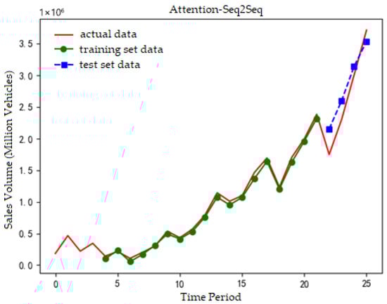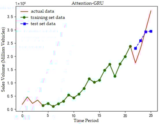 To facilitate valid comparisons between multi-variable and single-variable sales forecasting models, we minimize their structural differences as much as possible. The dataset was split into a training set (85%) and a test set (15%) for the NEVs forecasting models. The 85/15 partitioning adopted in the paper is a commonly used partitioning method in time series prediction tasks. Its purpose is to ensure that the training sequence of the learning model is long enough while retaining sufficient test data to evaluate the generalization ability. The selection of batch size is a balance point achieved between training efficiency and model stability under the existing computing resource conditions. During the training process, the loss curves of the training set and the validation set were closely monitored to confirm that the model tended to converge and no obvious overfitting or underfitting phenomena occurred. Three models were constructed: a standalone GRU neural network, a Seq2Seq model (with GRU for both encoder and decoder), and an attention-augmented Seq2Seq model (also using GRU for encoder and decoder). We set a random seed to ensure experimental reproducibility. For the NEV forecasting models, the number of neurons was set to 14, time steps to 3, batch size to 1, and training iterations to 500. The Attention-Seq2Seq model uses GRU to construct an encoder–decoder structure. After attention-weighting the input sequence, the encoder passes the final state to the decoder. The decoder output is processed through a fully connected layer and global average pooling to obtain a single predicted value. It adopts an auto-encoder training method: Train the sequence-to-numerical regression task using the same data as the codec input. Apply the attention mechanism to the encoder. The attention mechanism works by calculating independent time step attention weights for each feature dimension of the input sequence. First, perform dimension transformation on the input. Then, use the fully connected layer and the softmax activation function to generate attention weights. Finally, multiply these weights element-by-element with the original input to enhance the feature representation of important time steps and suppress unimportant time steps, enabling subsequent GRU layers to process the attention-weighted sequence information more effectively. The details are shown in Figure 2.
