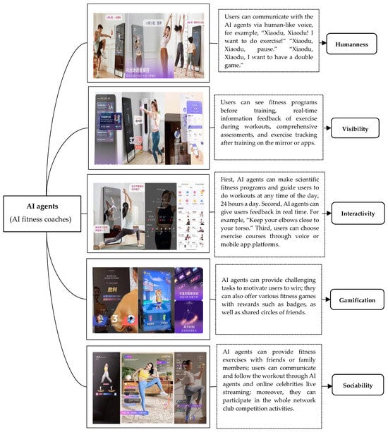 Accordingly, interactivity holds a predominant position across all indicators, establishing itself as the most distinctive and indispensable core concept in AI-powered fitness. Established research affirms its centrality as a key driver of user experience [5,20]. Operationally, this study defines interactivity as the bidirectional human–machine communication process characterized by voice-based control and real-time responsiveness, personalized guidance from the AI agent. Concurrently, paralleling gamification, sociability functions as another fundamental pillar of the system, emphasizing interpersonal connectivity [51]. For this research, sociability denotes the inherent attribute and functional capacity of an AI system to support, promote, and sustain human social interactions and relationship-building processes. Sociability refers to the degree to which the AI agent facilitates a perceived connection to a social environment, often by enabling social comparisons or social interactions among users to satisfy the innate need for connection with others (e.g., friends and family members) and receive social support(e.g., “The AI coach makes me feel I’m part of a group challenge”). This concept goes beyond the simple user–AI dyadic interaction. Gamification refers to the process of applying game design elements of AI agents to non-game contexts in order to create an enjoyable experience for users. Visibility refers to the dynamic, bidirectional exchange of information between humans and AI agents, orchestrated through sequential voice controls and instantaneous responsiveness to deliver personalized guidance. Humanness is conceptualized as the tendency to imbue real or imagined behavior of AI fitness coaches with humanlike characteristics or emotions, focusing on its static attributes that mimic human forms, such as a human-like name, or voice tone (e.g., “The AI coach sounds like a real person”). Its primary role is to make the interaction feel less machine-like. Therefore, AI agents integrates the five core features of interactivity, gamification, sociability, visibility, and humanness (see Table 3).