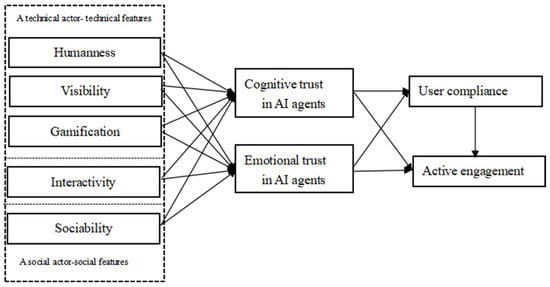 This study employs these five themes identified through text mining to integrate the CASA framework with trust in AI agents, thereby enhancing the explanation of user behaviors towards AI agents. As shown in the conceptual model (Figure 2), the independent variables include visibility, gamification, interactivity, humanness, and sociability. User compliance and active engagement serve as dependent variables, while cognitive trust and emotional trust in AI agents function as mediating variables.