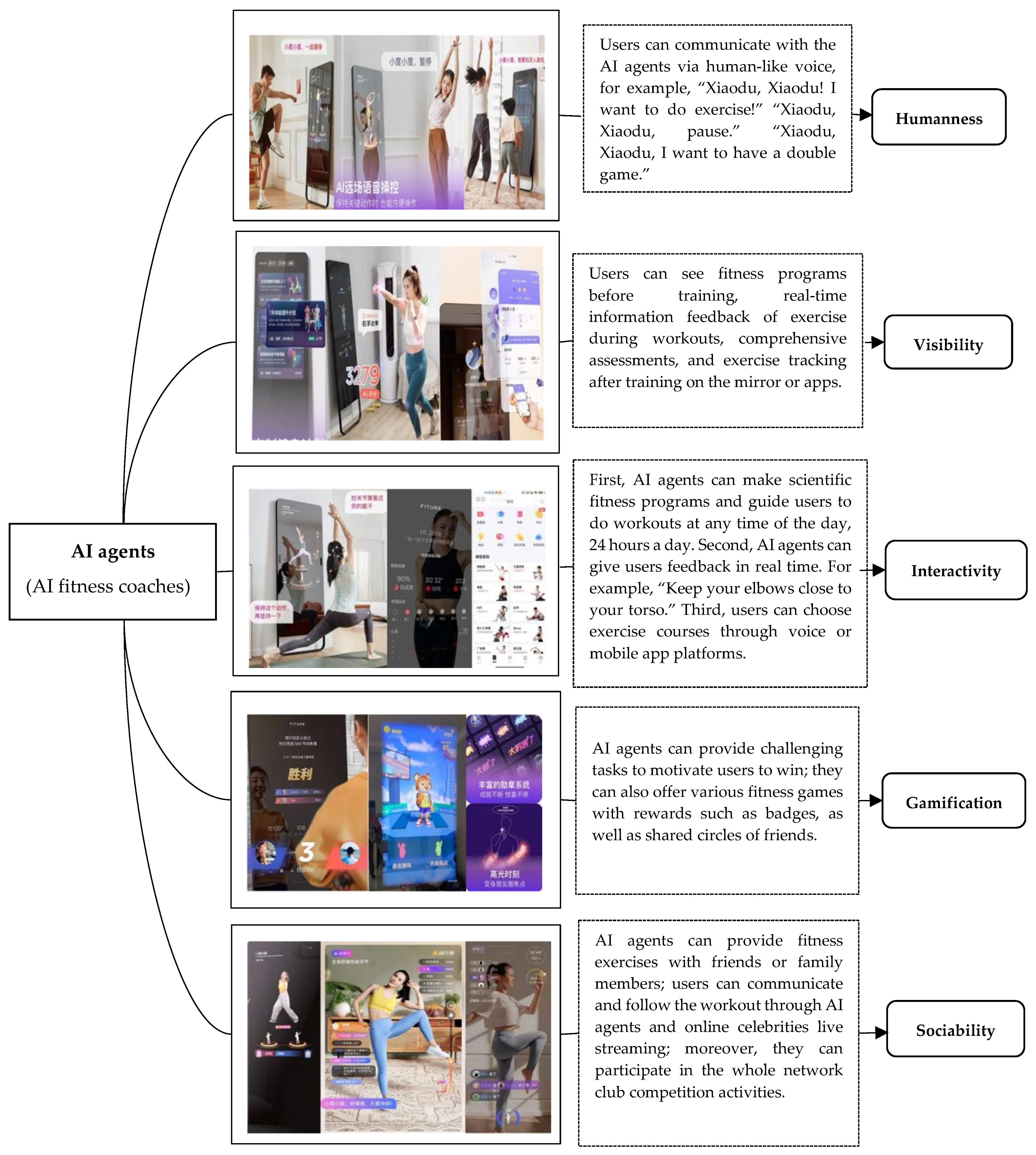 The Computers Are Social Actors (CASA) framework offers a valuable lens to analyze these dynamics [12]. CASA posits that individuals naturally apply human social rules to computers and AI systems, responding to them as they would to others, particularly when these systems exhibit human-like attributes [13,14]. By leveraging this tendency, our study attempts to develop AI agents (acting as AI fitness coaches) as social actors, not just technological tools. To achieve this, we focus on how five key features-humanness, visibility, gamification, interactivity, and sociability—influence users’ behavioral intention and outcomes, encompassing both user compliance and active engagement. Specifically, humanness, the assignment of human traits to AI [15], enabled users to form relational bonds, creating a sense of companionship and understanding [13], which imbued the AI with human-like qualities to enhance user trust [16]. Visibility ensures that the AI processes, recommendations, feedback, and progress tracking are transparent and easily understood, thereby enhancing user confidence in AI processes [17]. Further, previous work showed that gamification was effectively enhancing user engagement [18], which transformed routine fitness tasks into engaging challenges. Moreover, interactivity was crucial in shaping a favorable user experience [19], which could be a foundation for building user trust [20,21]. For instance, from a functional perspective, AI agents (e.g., AI fitness coaches) utilize real-time, 24/7 personalized guidance through responsive two-way communication. In addition, sociability fosters a sense of community or companionship through shared goals and virtual interactions. These social elements have been established as key antecedents for cultivating trust in AI agents and are directly associated with behavioral engagement [22]. Building on these insights, we posit that these five features may foster initial user trust and create a more engaging experience.