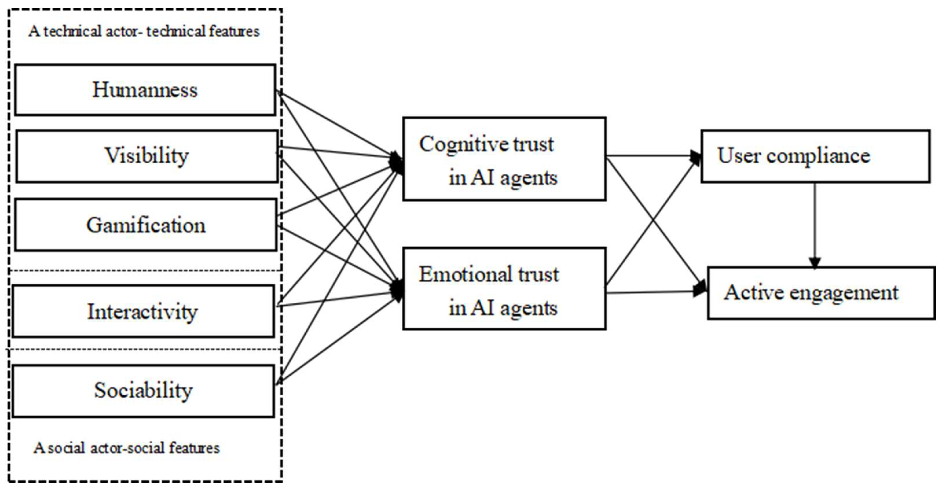 The widespread application of the CASA paradigm reflects a growing tendency to perceive AI systems as social actors. Thus, there is an increasing relationship between humans and AI, ranging from monitors or assistants to coaches, and the expected focus shifts from utility to humanness, hedonism, socialization, and interactivity. In line with this perspective, our study employs a social actor lens to explain how AI agents (e.g., AI fitness coaches) present their core features or potential capabilities (e.g., humanness, visibility, gamification, interactivity, and sociability; see Figure 1) to users. We propose that these features shape users’ cognitive and emotional trust, which in turn drive two key behavioral outcomes: user compliance and active engagement. Overall, it offers a theoretical foundation for understanding how users perceive and respond to AI agents (e.g., AI fitness coaches) during exercise.