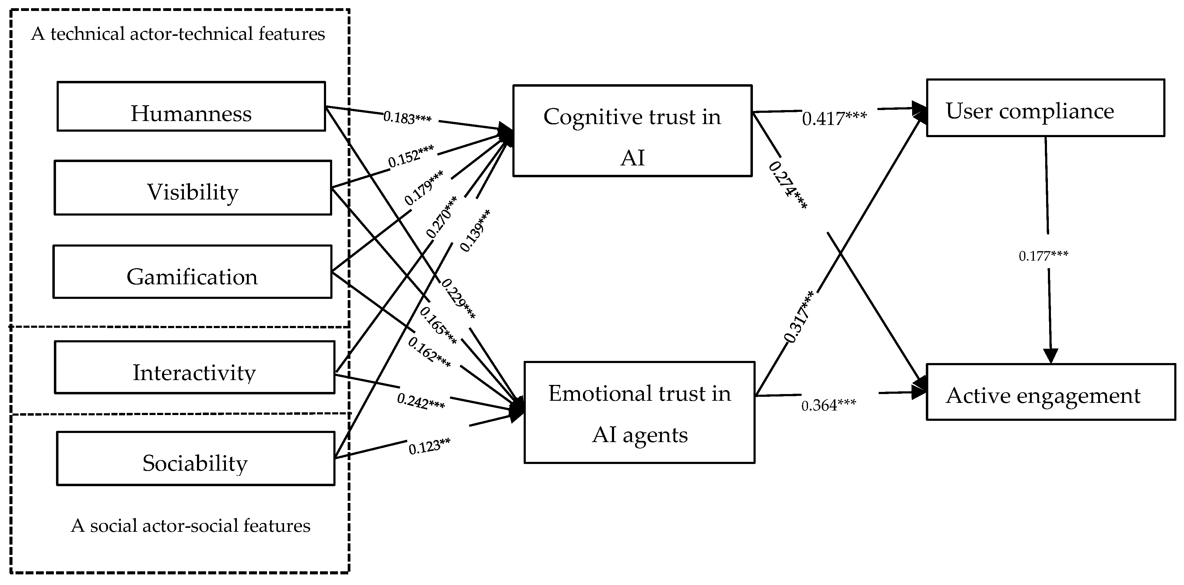 Notes: HU: Humanness; VI: Visibility; GA: gamification; IN: interactivity; SO: sociability; CT: cognitive trust in AI agents; ET: emotional trust in AI agents; UC: user compliance; AE: active engagement; ** = p < 0.01, *** = p < 0.001.