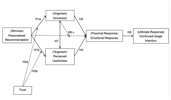 To address the aforementioned research gaps, this study develops an integrated research model grounded in the stimulus–organism–response (S-O-R) framework to systematically examine the following core issues: whether, in AI–AR integrated e-commerce environments, personalized recommendations influence consumers’ continuance intention through parallel cognitive (perceived usefulness) and experiential (immersion) pathways (RQ1); and whether platform trust serves as a boundary condition that moderates the effects of personalized recommendations on both cognitive (perceived usefulness) and experiential (immersion) pathways (RQ2).