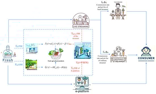 With the rapid development of the Internet, the e-commerce industry in the field of fresh agricultural products has gradually emerged. Especially in recent years, live streaming e-commerce has developed rapidly and become a significant sales avenue for fresh agricultural products. Evidence from major promotional events illustrates its expanding influence: during the “Tmall 618” campaign (a major mid-year online shopping festival hosted by Alibaba’s Tmall platform), the fresh food category saw a GMV growth rate exceeding 261%, attributable to live streaming (https://baijiahao.baidu.com/s?id=1802257171027885821&wfr=spider&for=pc accessed on 12 December 2024). Influencer collaborations, such as that between YouTube creator Ann Reardon and the brand HelloFresh, have further demonstrated the model’s capacity to enhance brand visibility and sales (https://www.cifnews.com/article/158422 accessed on 12 December 2024).