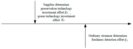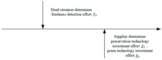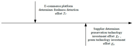 This quadratic cost function is common in economics and supply chain research because it reflects the real-world situation of “the more you invest, the higher the marginal cost,” and it is convenient for mathematical modeling and solving optimal decisions. Where are the cost coefficients of green technology investment efforts, preservation technology investment efforts and freshness detection efforts, respectively. These cost coefficients (λ) represent the economic efficiency of corresponding investments, where higher values indicate greater marginal costs for achieving the same level of technological improvement or detection accuracy.