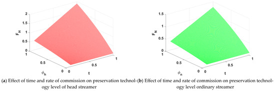 Corollary 4 shows that when the supplier chooses to cooperate with the head/ordinary streamer to sell fresh agricultural products, the commission rate serves as a pivotal determinant of each party’s strategic decisions. Specifically, the commission rate is negatively related to PTIE and GTIE decided by the supplier. A higher commission rate reduces the supplier’s profit margin, which in turn lowers investment in preservation and green technologies. On the contrary, the head/ordinary streamer’s commission rate is positively correlated with the FDE decided by the streamer. Similarly, this is because the higher the streamer’s commission rate, the more they earn, and the more money they have to invest in product preservation testing. This dual-direction mechanism highlights a fundamental trade-off in streamer-based supply chains: while higher commissions can strengthen downstream quality monitoring, they may simultaneously weaken upstream production-side investment. Therefore, designing a balanced commission structure becomes critical to aligning incentives across the chain and achieving coordinated improvements in both product quality and supply-chain profitability.