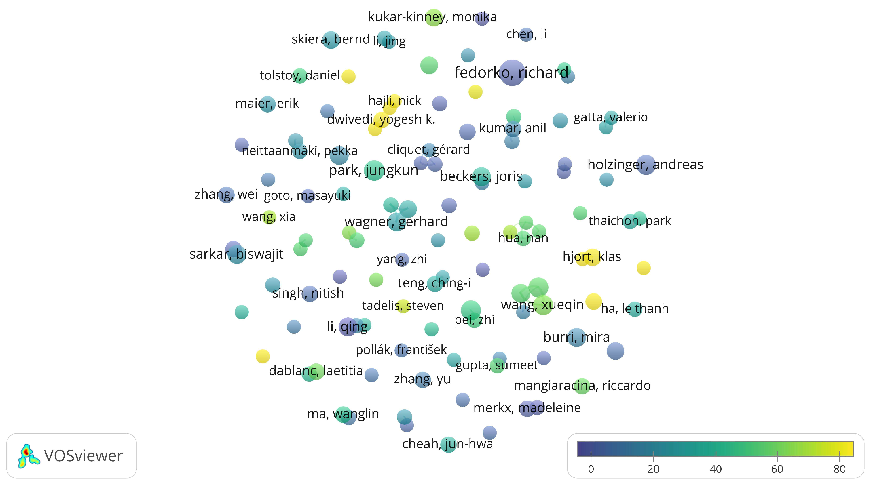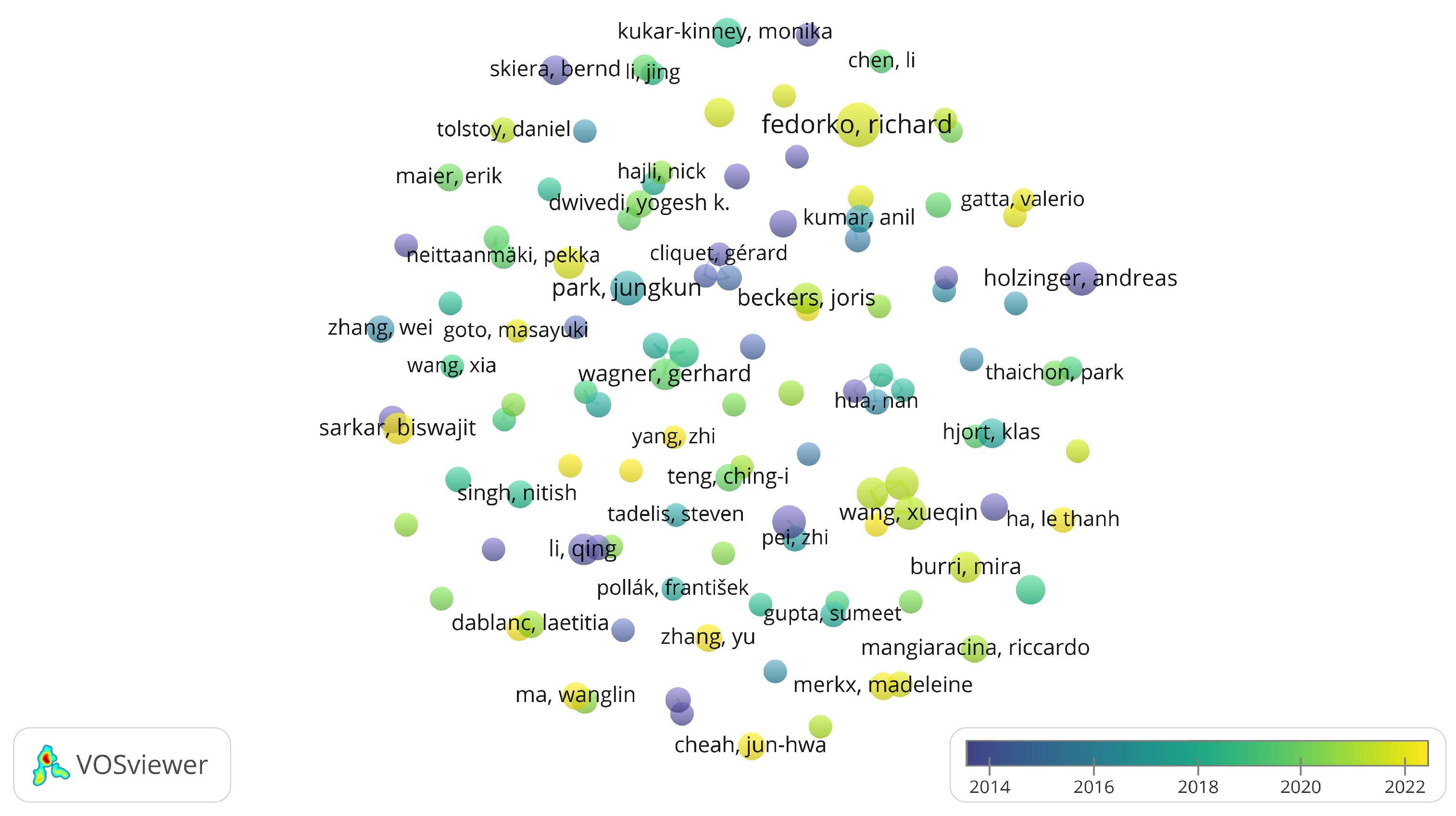 Figure 2, larger nodes correspond to authors with more publications, and colours show the average publication year. In