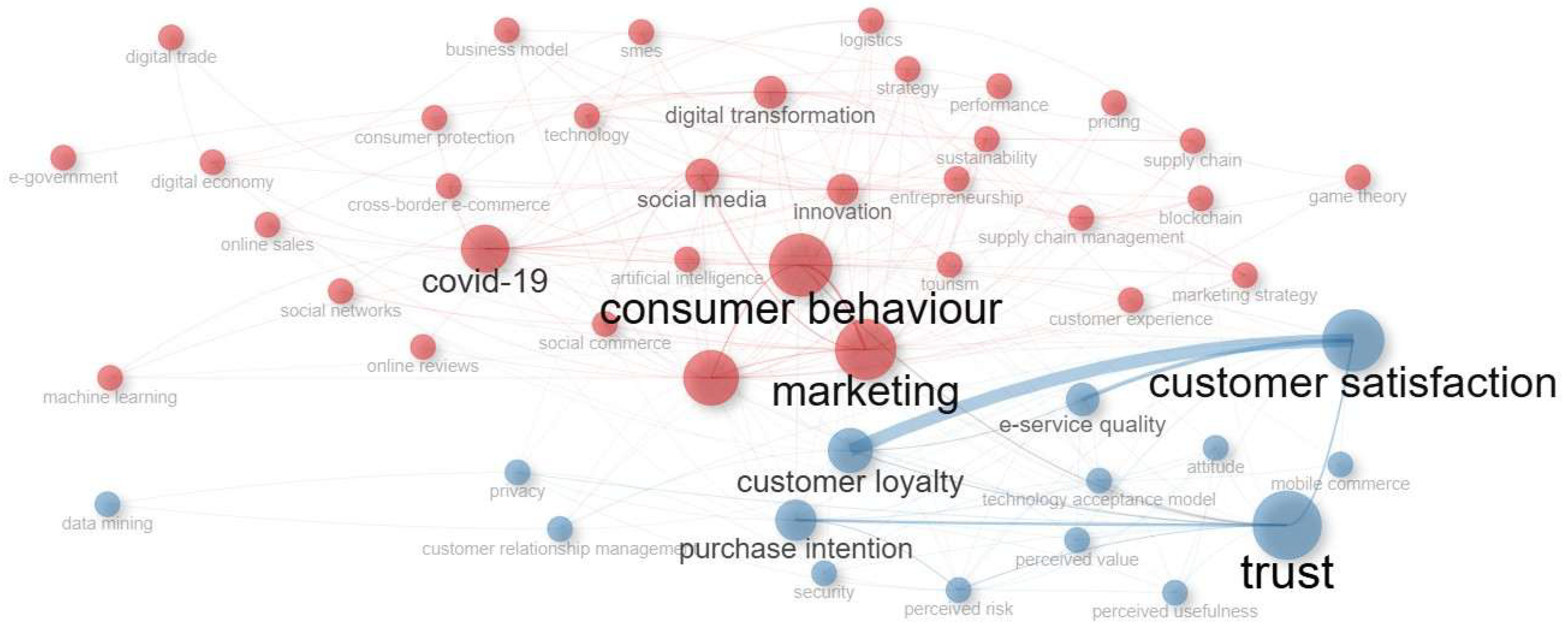 Cluster 1—COVID-19—includes topics related to digital transformation, innovation, digital economy, supply chain management, cross-border e-commerce, entrepreneurship, logistics, business models, AI, game theory, sustainability, strategy, and more. It is the most extensive research area (1074 articles) and has reasonable centrality, reflecting its influence and connections between clusters. It has good coherence, as indicated by high density, but lower centrality, focusing on more specialized directions. Concerns regarding the impact of COVID-19 on e-commerce, although accounting for approximately 12.5% of the analysed corpus, are positioned in the Niche Themes quadrant of the diagram. Their low centrality indicates that, despite their number, COVID-19—related articles are thematically isolated, forming a dense cluster with few semantic links to fundamental topics such as consumer behaviour, trust, customer satisfaction, customer loyalty, marketing, or retailing. The topic is episodic, having emerged suddenly, and is primarily connected to aspects closely related to technological transformations and developments. Given the recency of COVID-19—focused studies, these articles often tend to be self-referential, which significantly limits their connections with other relevant keywords in the field. Their positioning in the insular zone of the diagram does not contradict the importance of the topic; rather, it reflects that the theme does not function as a central node linking the dominant themes of the field, since centrality represents the degree of interconnection with other core topics rather than absolute frequency.