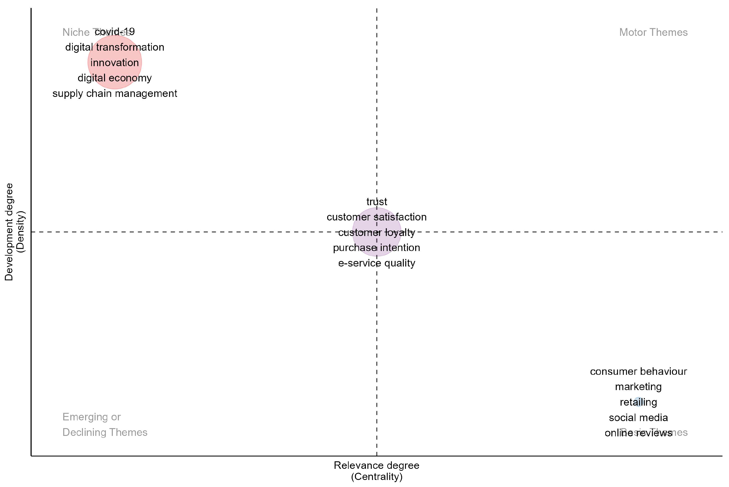 113]. These are considered common, widely spread, and fundamental to the field, yet not highly developed internally. In the dataset analysed, they represent an extensive and active research area (681 articles), including topics related to marketing, customer behaviour, retailing, social media, online reviews, customer relationship management, and data mining. These themes are well-connected to the rest of the domain, being fundamental and widely prevalent, but not highly specialized or internally developed. Themes in this category constitute the conceptual foundation for other research, as any study on e-commerce is inevitably connected or influenced by consumer behaviour and marketing, regardless of whether it addresses trust, satisfaction, technologies, innovation, or digital transformation.