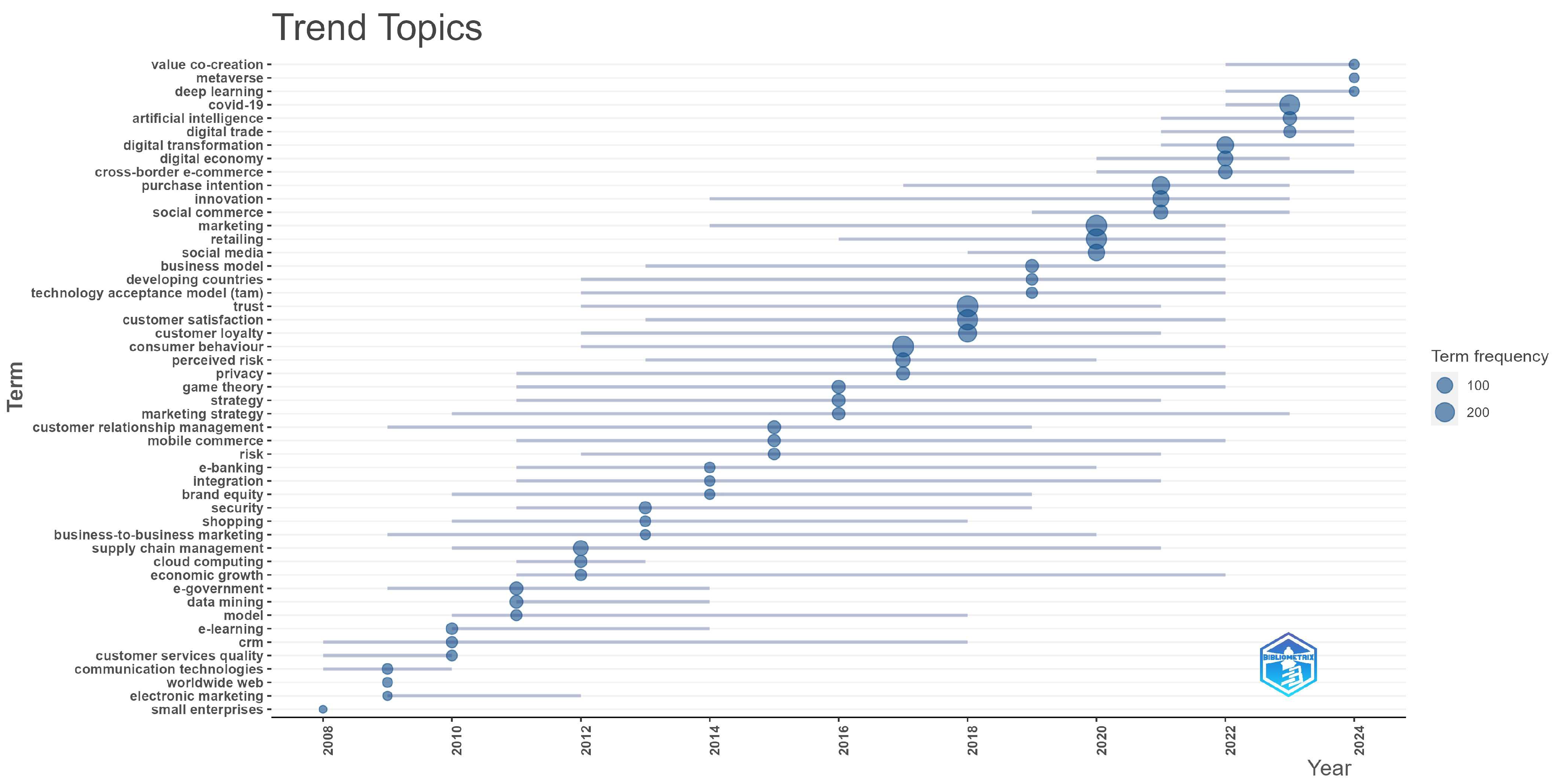 The result indicates that trust (271) was the most frequently used concept throughout the analysed period, followed by consumer behaviour (266), marketing (255), customer satisfaction (240), retailing (239), and COVID-19 (224). Trust, customer satisfaction, and customer behaviour dominated research interests from 2012 to 2022, while retailing was a prominent focus from 2016 to 2022. Digital transformation gained notable attention more recently, specifically in the period from 2021 to 2024. In recent years, there has been a growing interest in the analysis of disruptive technologies such as deep learning, AI, digital trade, digital economy, as well as the effects of the COVID-19 pandemic and citizen involvement through value co-creation. The most enduring topics are marketing strategy (2010–2023), economic growth (2012–2022), mobile commerce (2011–2022), game theory (2011–2022), privacy (2011–2022), and supply chain management (2010–2021). In 2024, the metaverse emerged as a novel research topic within psychology, drawing significant scholarly attention. Numerous other subjects were analysed during this period, some with a more general focus, such as customer relationship management, risk, social commerce, innovation, integration, etc., while others were more specific, such as e-commerce platforms, electronic banking, social commerce, etc.