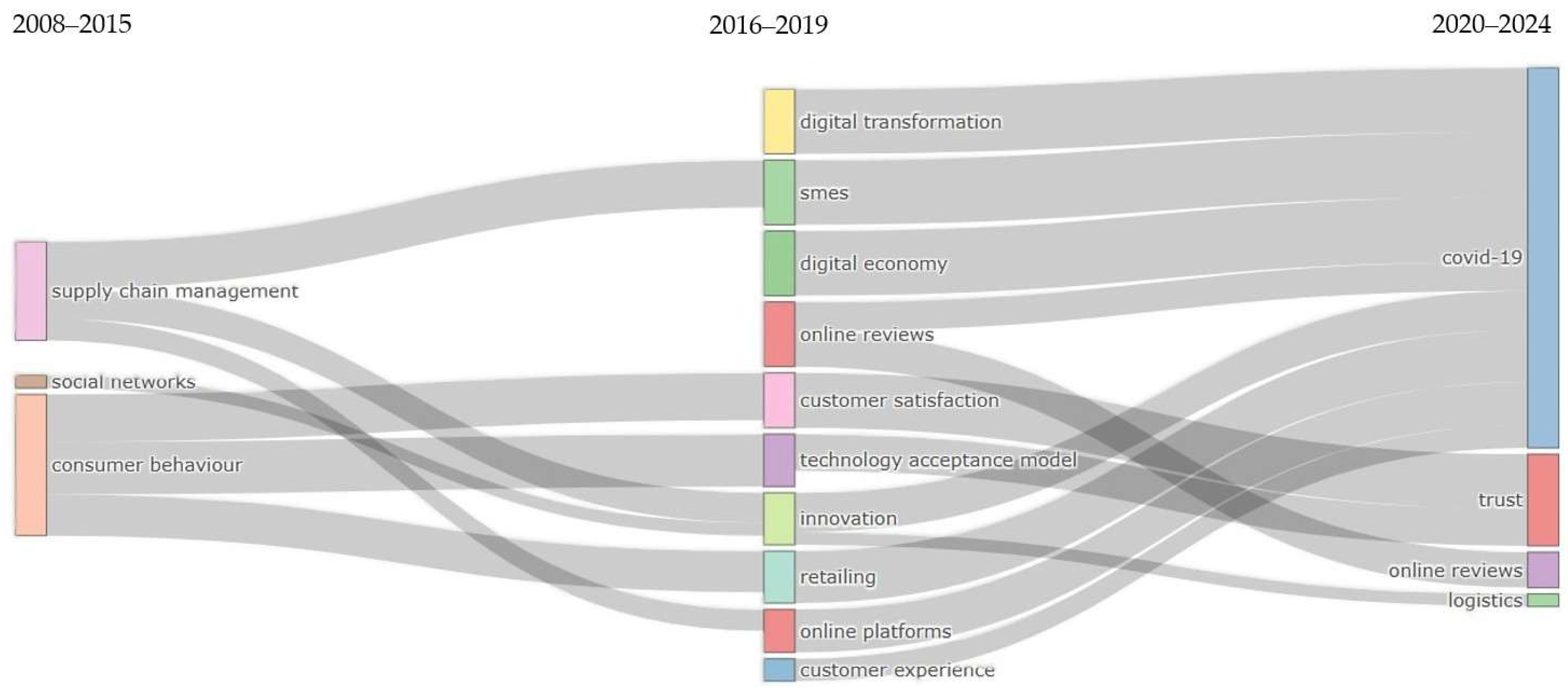 Figure 9 with a Sankey diagram, divided into three periods: 2008–2015, 2016–2019, and 2020–2024. Each cluster represents a research topic or theme, and its size reflects the number of publications on that theme. The research from the first analysed period focused on customer-centric concerns, including topics such as social networks and consumer behaviour, but also on the supply process, with studies addressing supply chain management. In the following period, there has been a growing interest in concepts such as retail, SMEs, consumer experience, consumer satisfaction, innovation, online reviews, and TAM, as well as ICT topics including digital transformation and digital economy. These topics are influencing both businesses’ and customers’ exposure and choices. E-commerce is often mentioned as part of the digital economy. A synthesis of studies focusing on retail, SMEs, customer experience, digital transformation, innovation, online platforms, and the digital economy was observed during the 2021–2024 period, linked to the challenges brought by COVID-19. In addition, between 2020 and 2024, customer satisfaction was analysed using the TAM to reflect the role of trust in e-commerce.