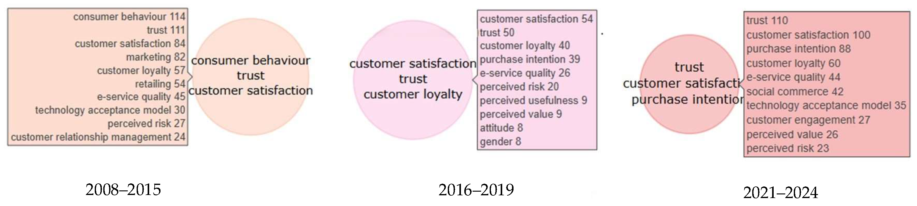 purchase intention. This reflects an evolution from its role as a fundamental concept to a strategic one, oriented toward influencing purchase intention and optimizing the consumer experience. The following figure illustrates the evolution of research on trust in the analysed domain across these periods (