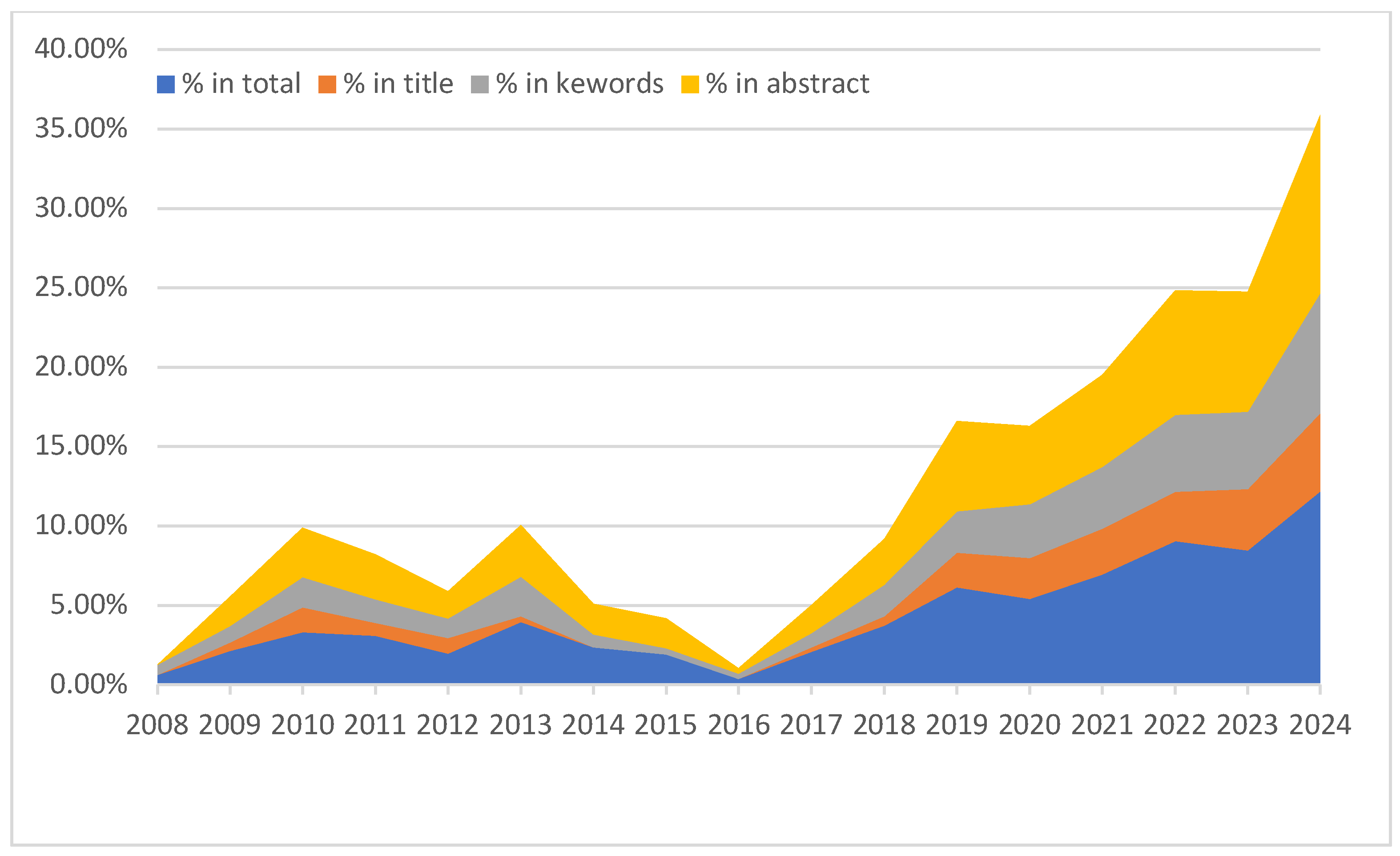chatbots, and others. Furthermore, direct analyses of the dataset show a continuous increase in the number of articles including these concepts in the title, abstract, or keywords, with peaks observed in 2022 and 2024 (