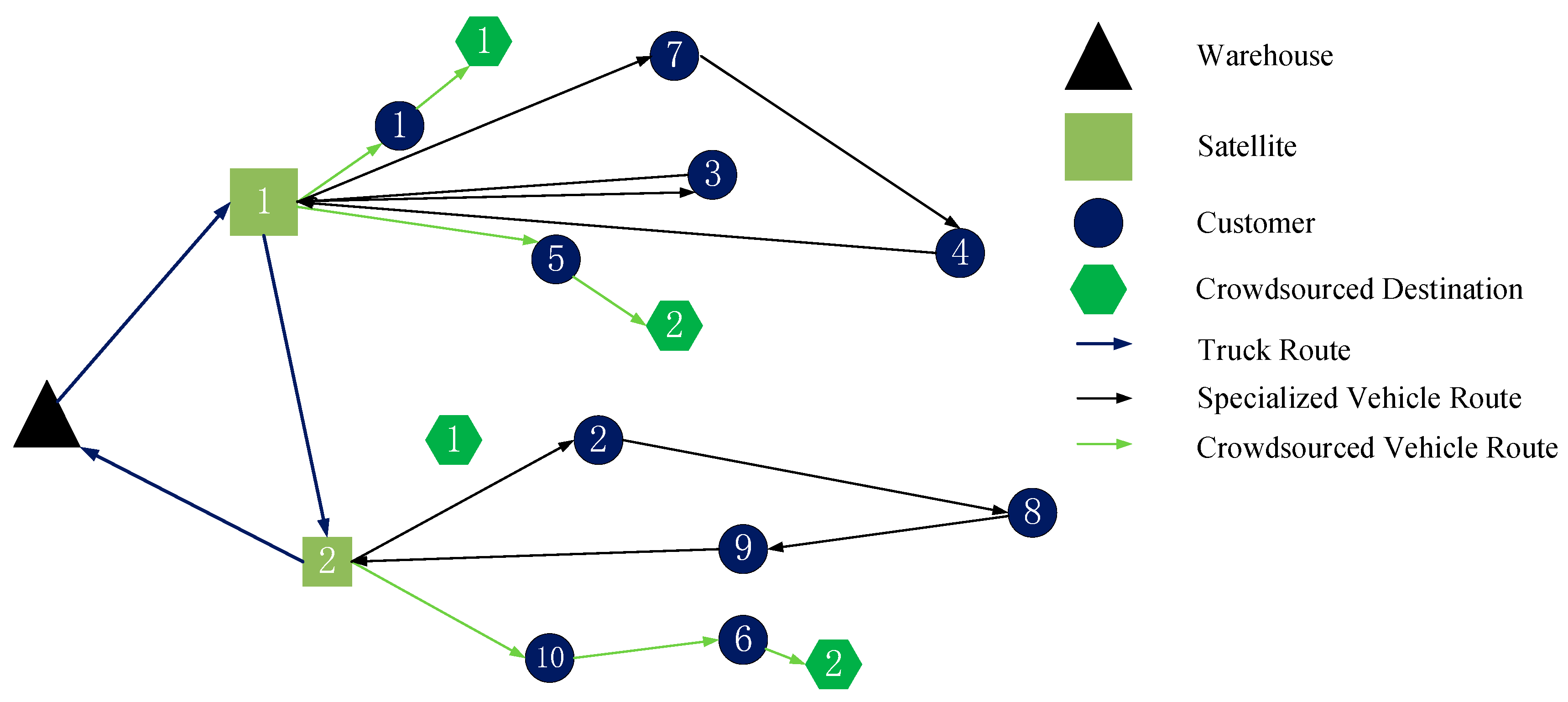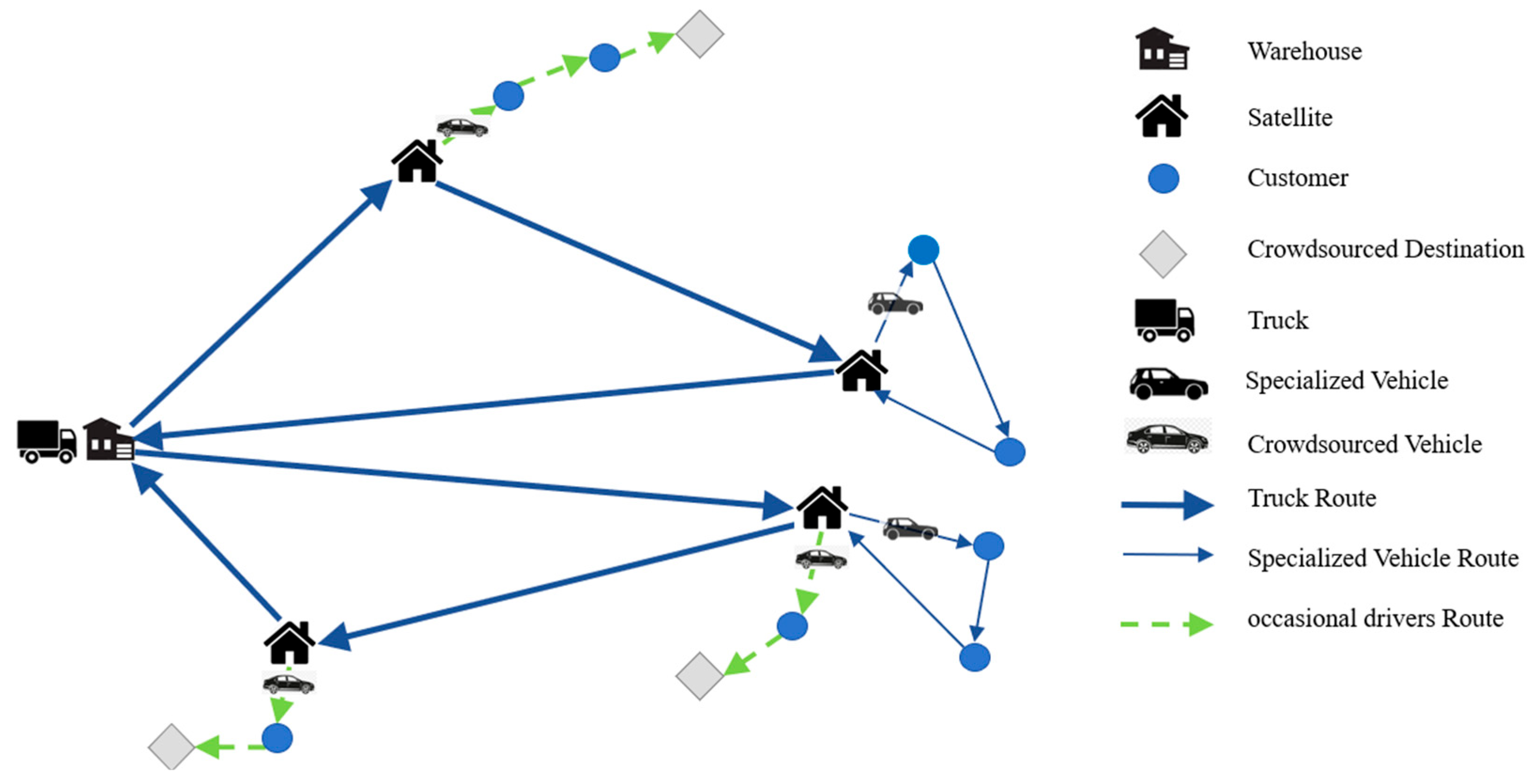 7]. GVRP and 2E-VRP have both been extensively studied in theory and algorithms. However, research on integrating crowdsourced capacity into urban green logistics systems remains limited. Specifically, there is still a lack of a mature framework for coordinating proprietary and crowdsourced capacity in multi-agent collaborative optimization. To fill this gap, this study develops a green last-mile delivery routing optimization model that incorporates a crowdsourcing mode. The model aims to improve resource utilization efficiency and lower carbon emissions. It also provides theoretical and practical support for the green transition of e-commerce companies and delivery platforms.