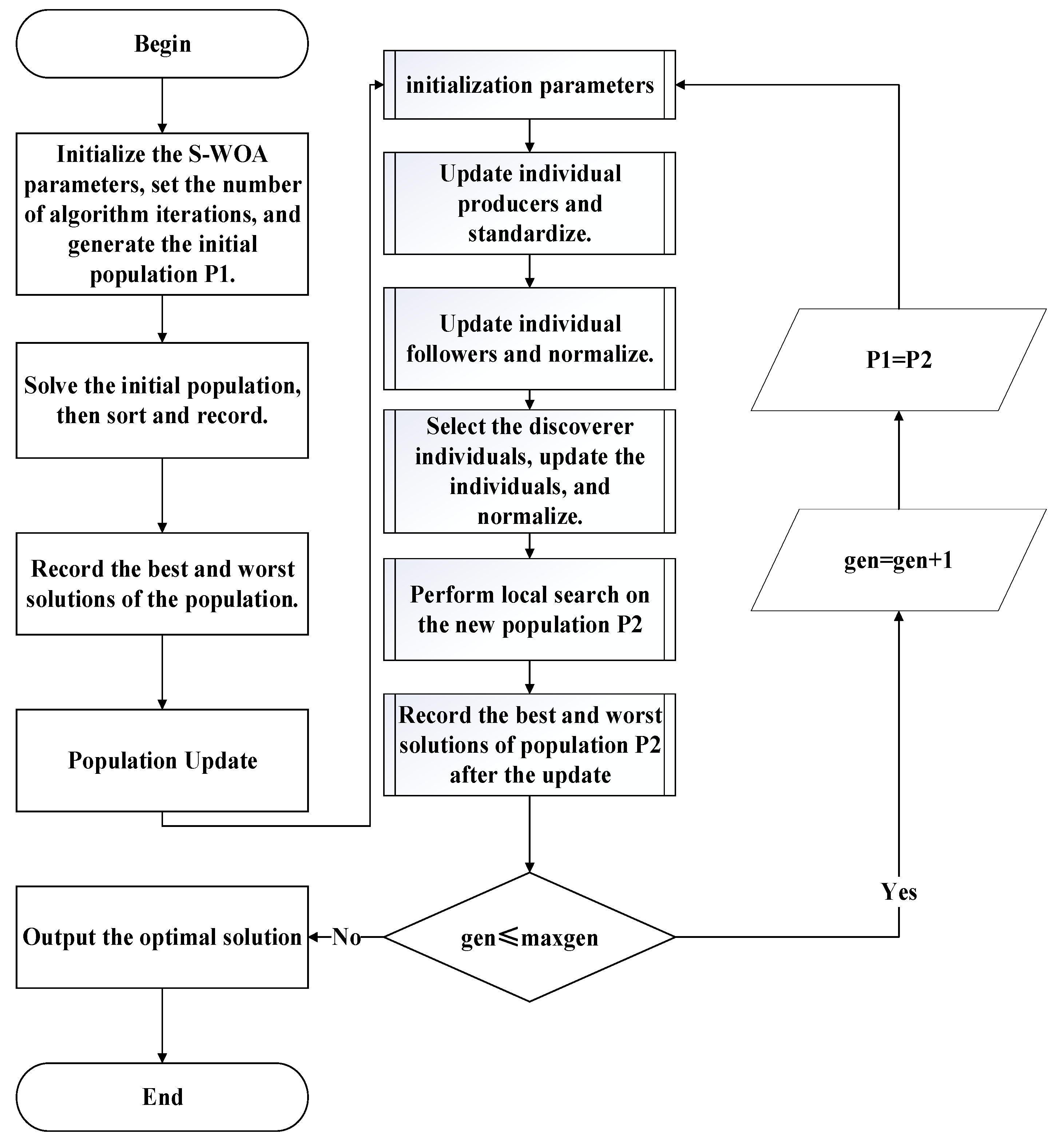 To solve the proposed bi-objective optimization model, this paper follows the common approach in most research in this field, using the weighted sum method to transform the bi-objective problem into a single-objective problem for solution. For the solution algorithm, a hybrid heuristic method, the Sparrow–Whale Optimization Algorithm (S-WOA), is designed by integrating the sparrow search mechanism [